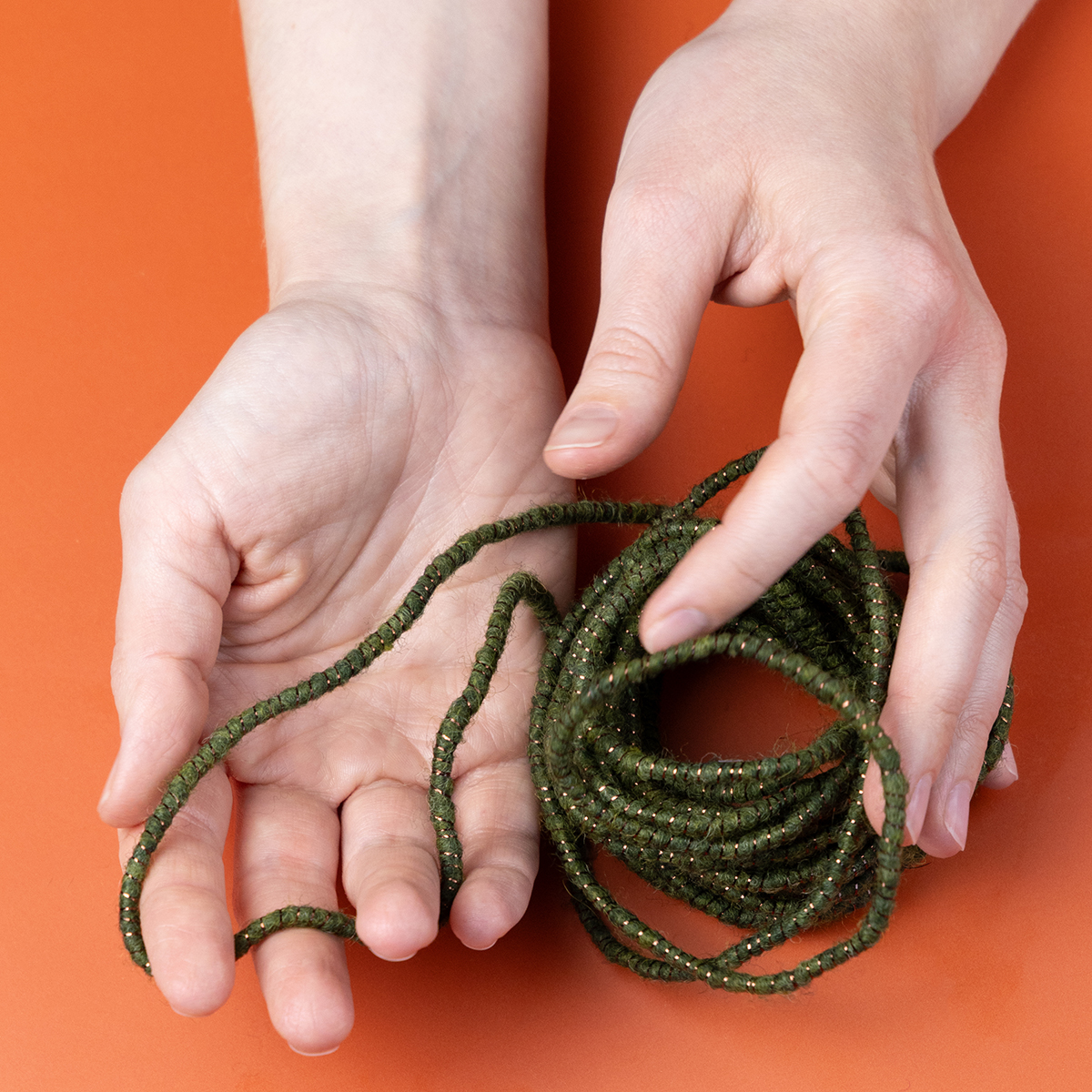 Produkto pavadinimas: Žalia vilnonė virvelė su auksiniais siūlais, 5 m x 5 mm su viela, dekoravimui ir rankdarbiams