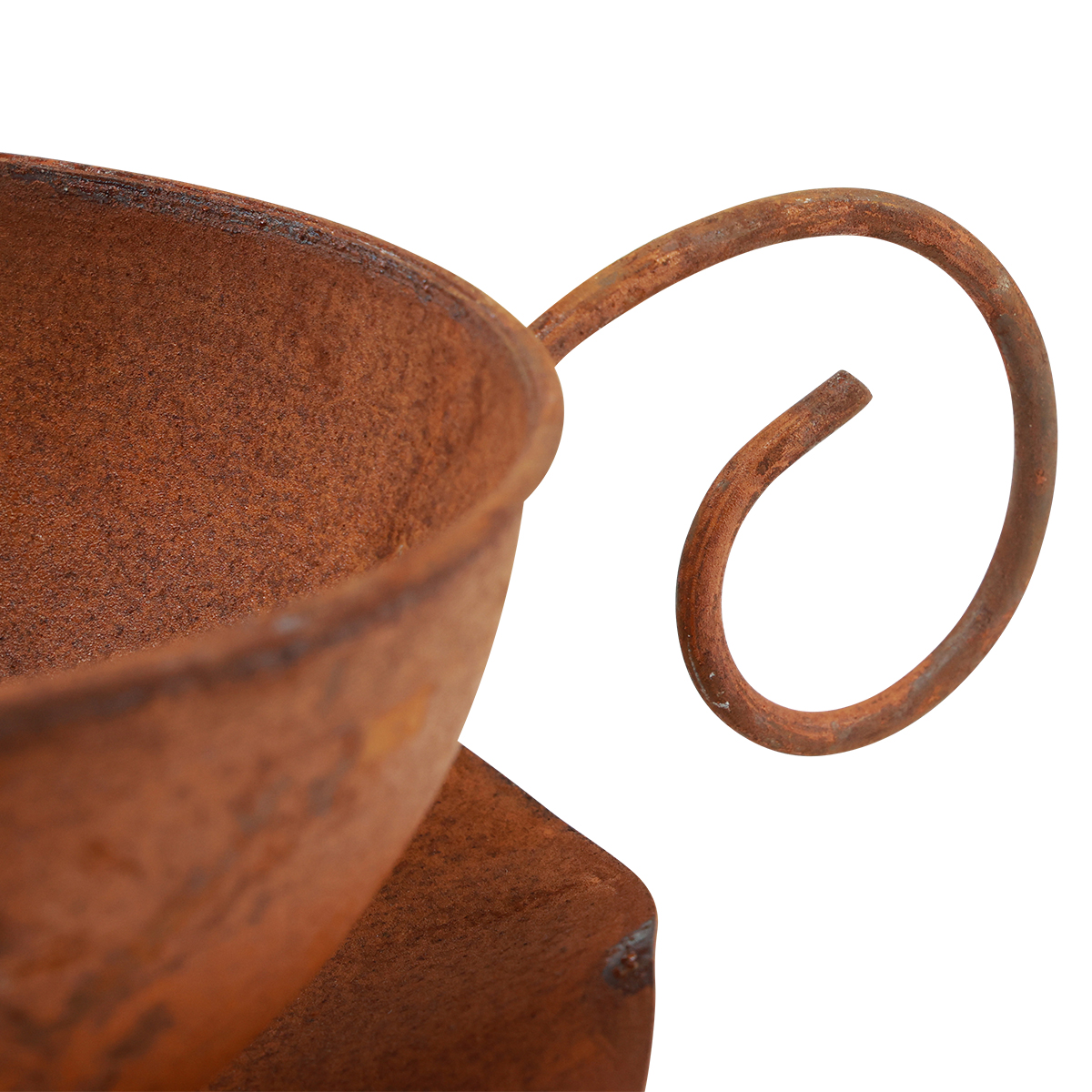 Tačiau sodo puošmena su rūdžių išvaizda taip pat gali būti interpretuojama kaip arbatos puodelis su lėkšte. Tikrai įgausite originalią balkono dekoraciją ar stalo dekoraciją terasos stalui su vazonu!