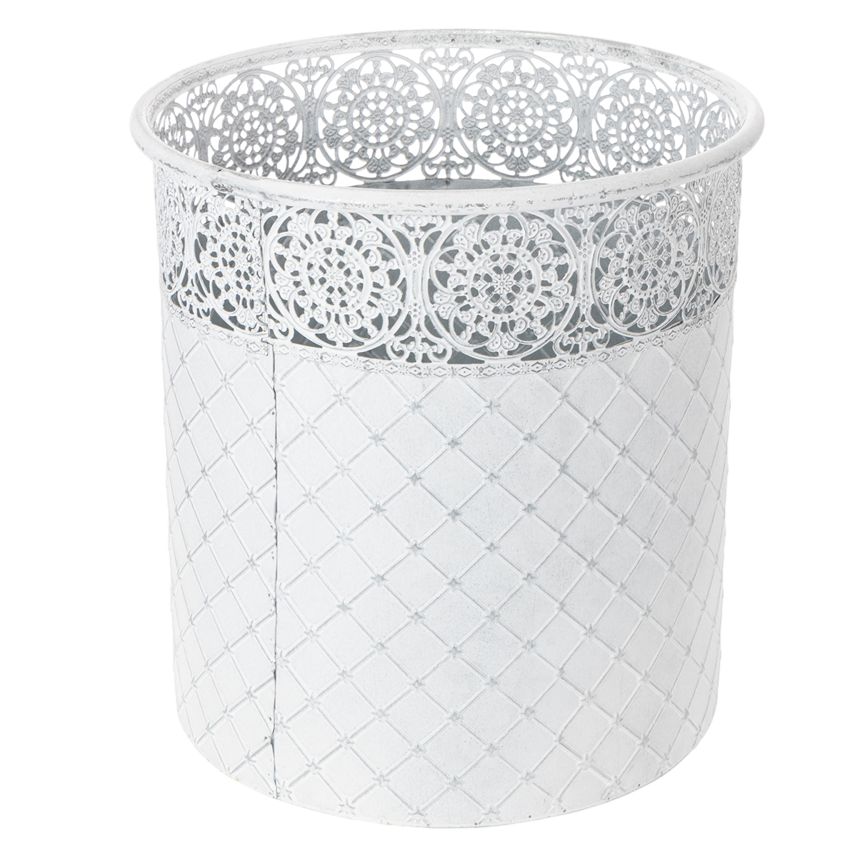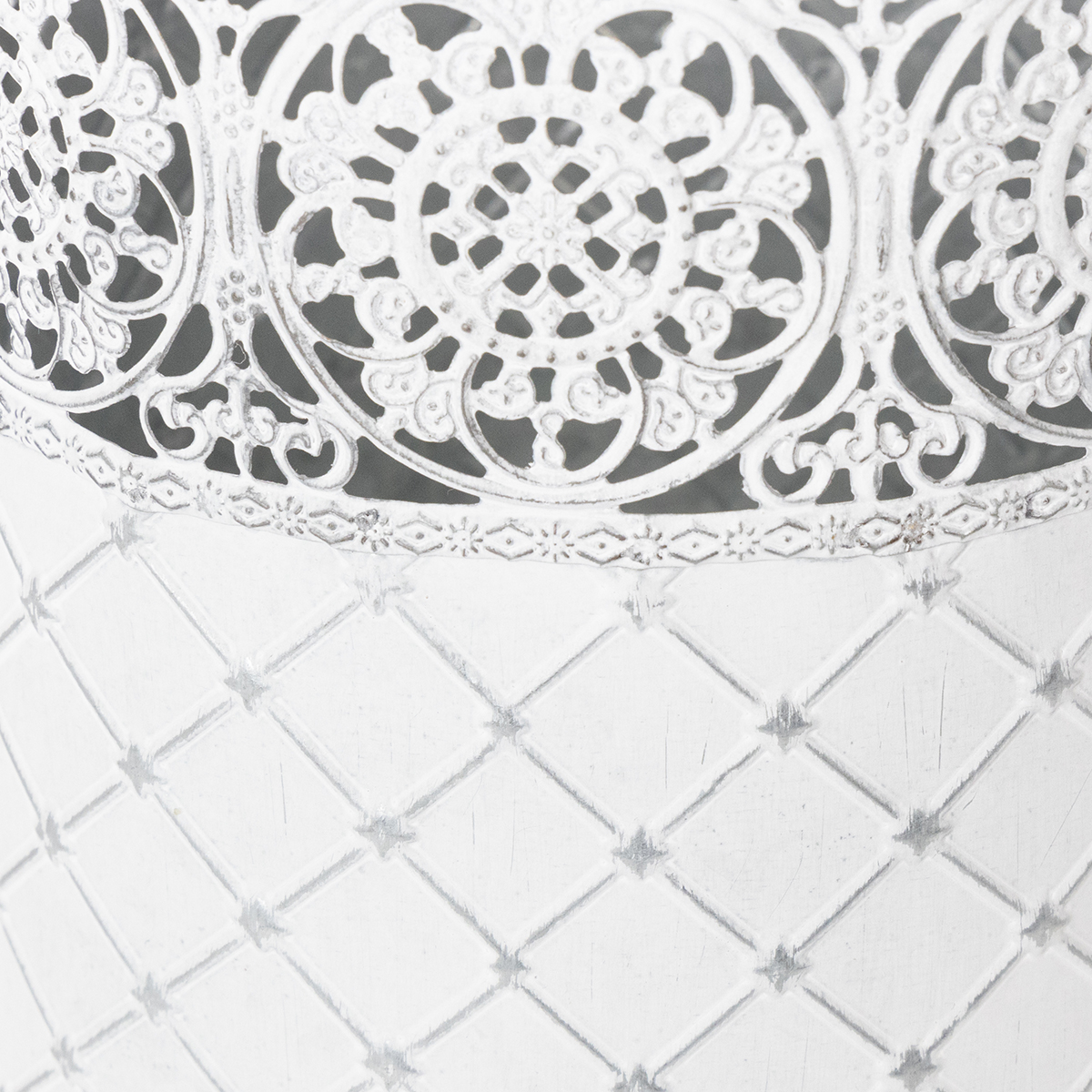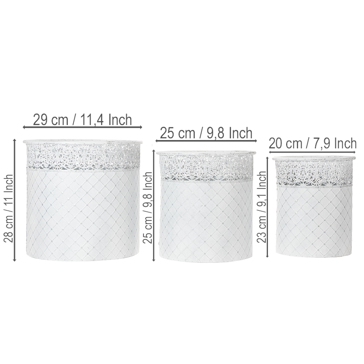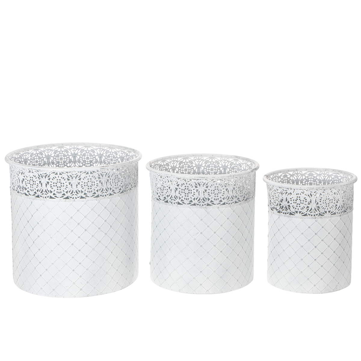 Augalų vazonas su nėrinių raštu, metalinis indas, dekoratyvinis kibiras, balta, sidabrinė, shabby chic spalvos, aukštis 28/25,5/23,5 cm, Ø 29,5/25,5/20 cm, 3 vnt. rinkinys