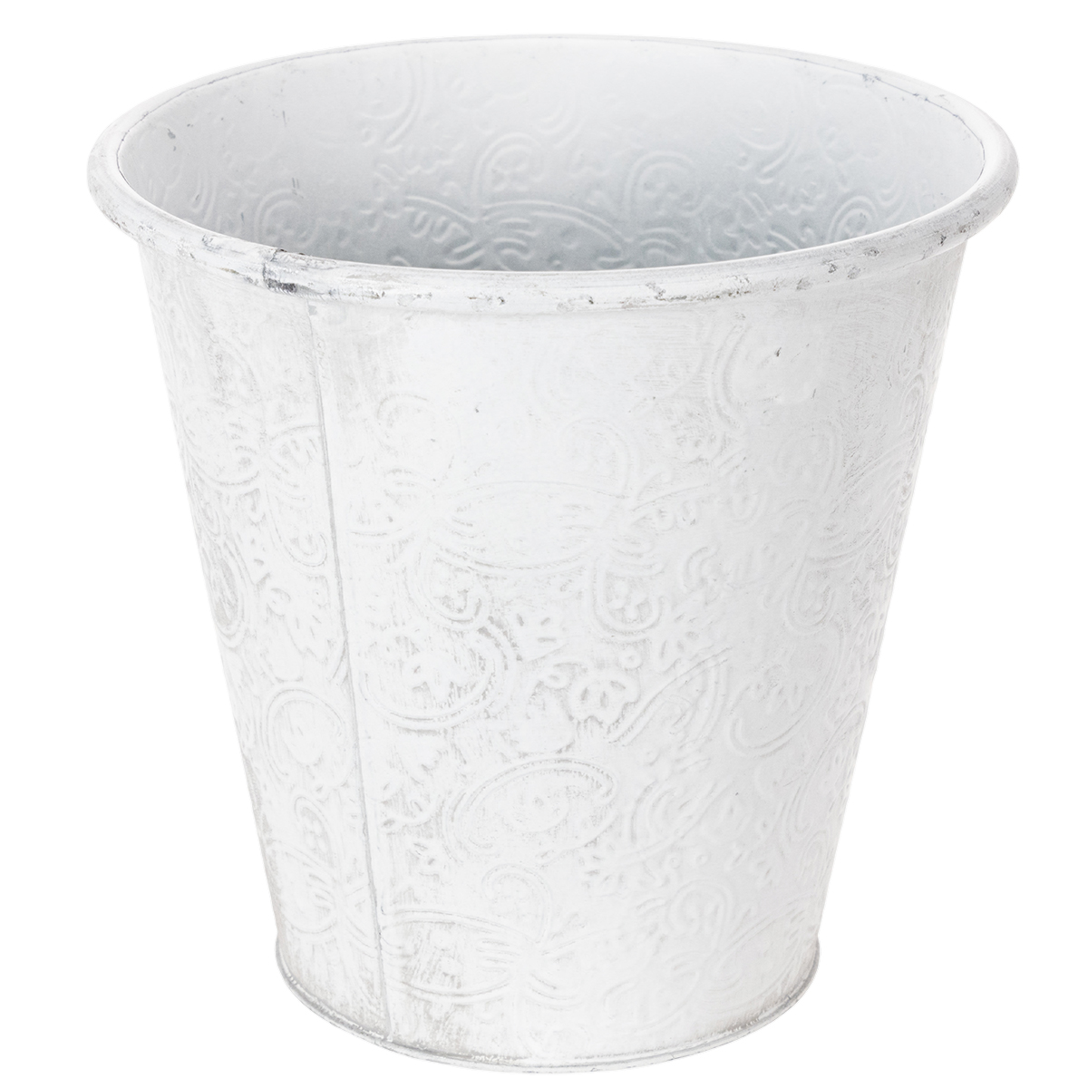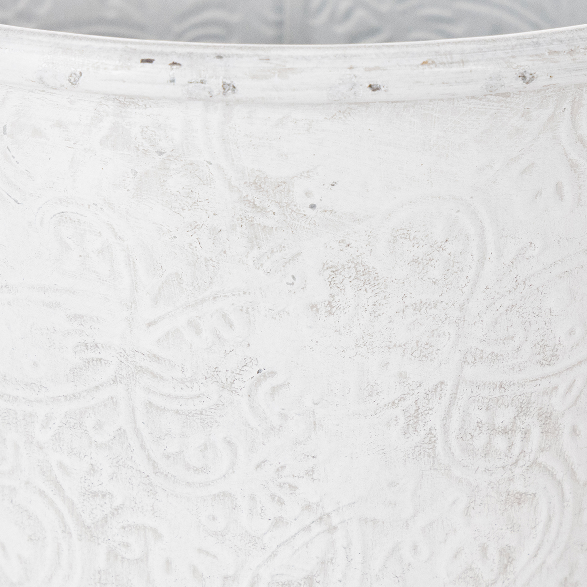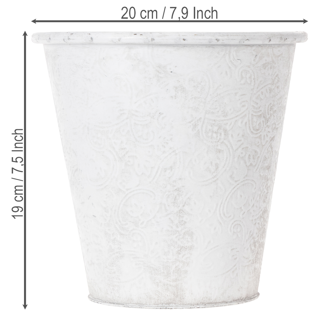 Pasaką primenantis kačetas papuoštas ornamentais: Metalinė puošmena aplinkui išmarginta gėlių gėlėmis. Dėl savo romantiškos išvaizdos ir balto skalbimo madingoje skurdžioje prašmatnėje metalinis indas taip pat puikiai tinka kaip vintažinio stiliaus stalo puošmena ir gėlių dekoracija vestuvėms!