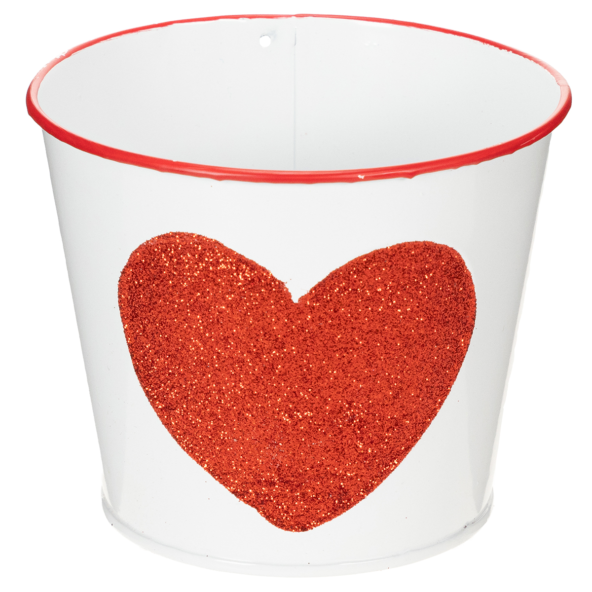 Gražus klasikinio dizaino gėlių vazonas. Baltas skardinis kibiras yra puodelio formos, turi raudoną apvadą ir raudoną širdies formą.