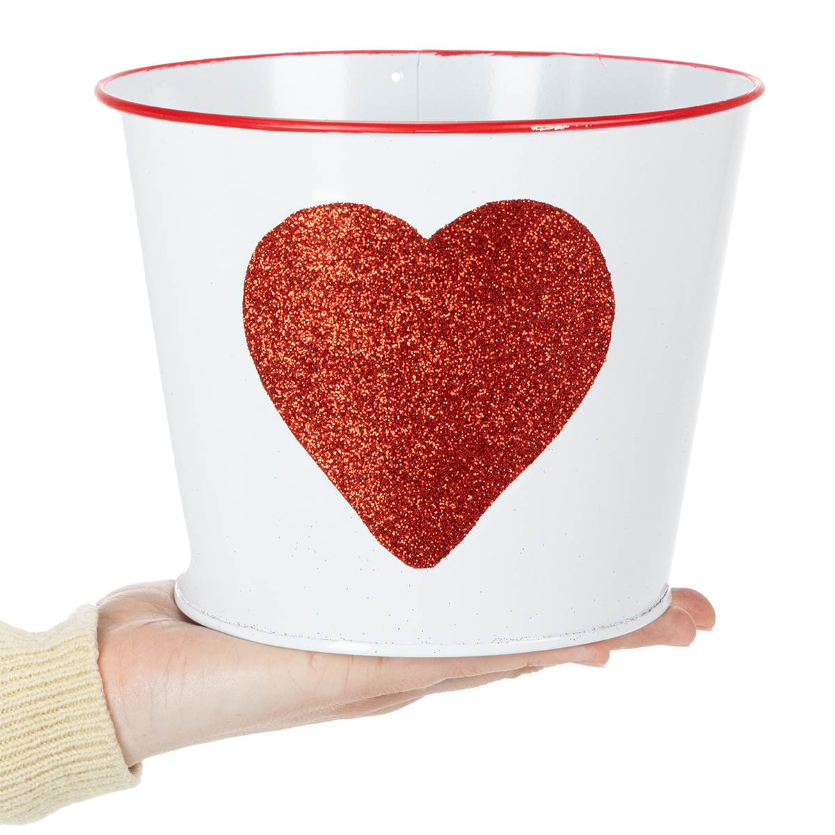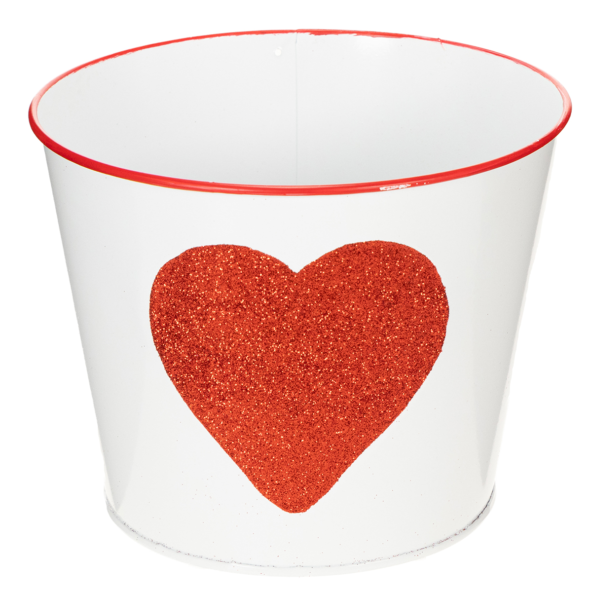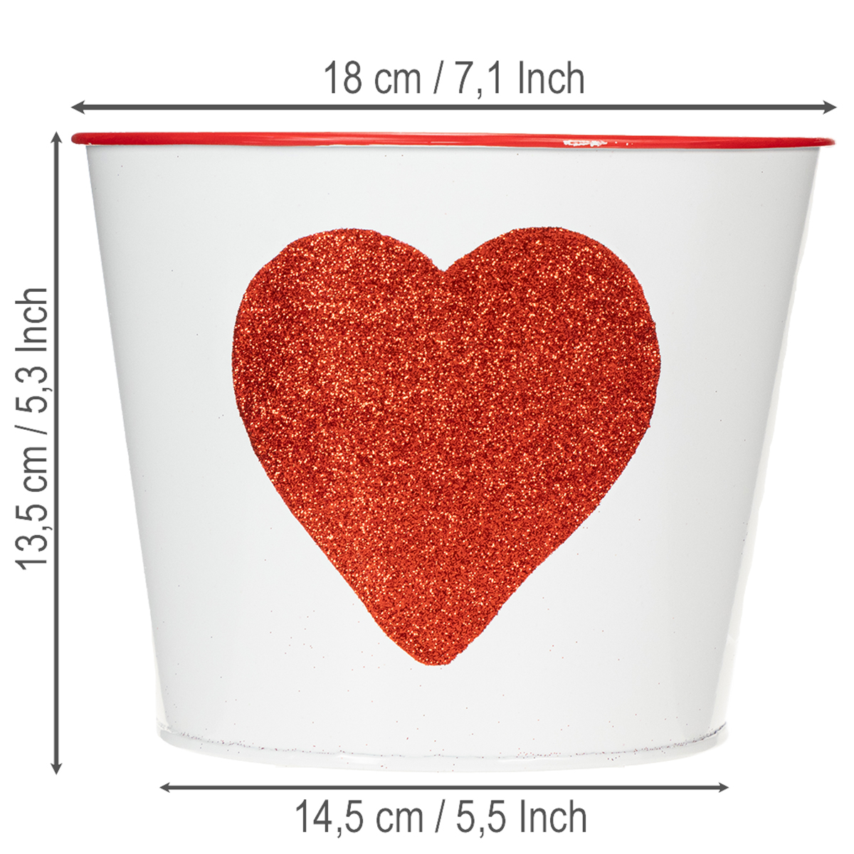 Šis spindinčios širdelės formos gėlių vazonas idealiai tinka orchidėjų dovanoms Valentino dienos proga. Baltas skardinis kibiras turi labai romantišką širdį su raudonais blizgučiais ir raudonu apvadu viduryje. Su tokiu klasikiniu dizainu mama taip pat džiaugsis augalu ar gėle Motinos dienos proga.
