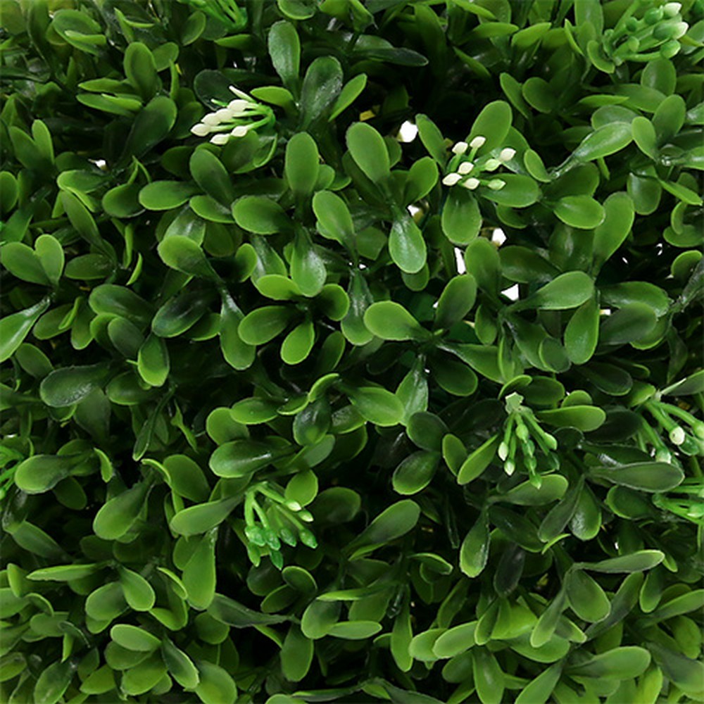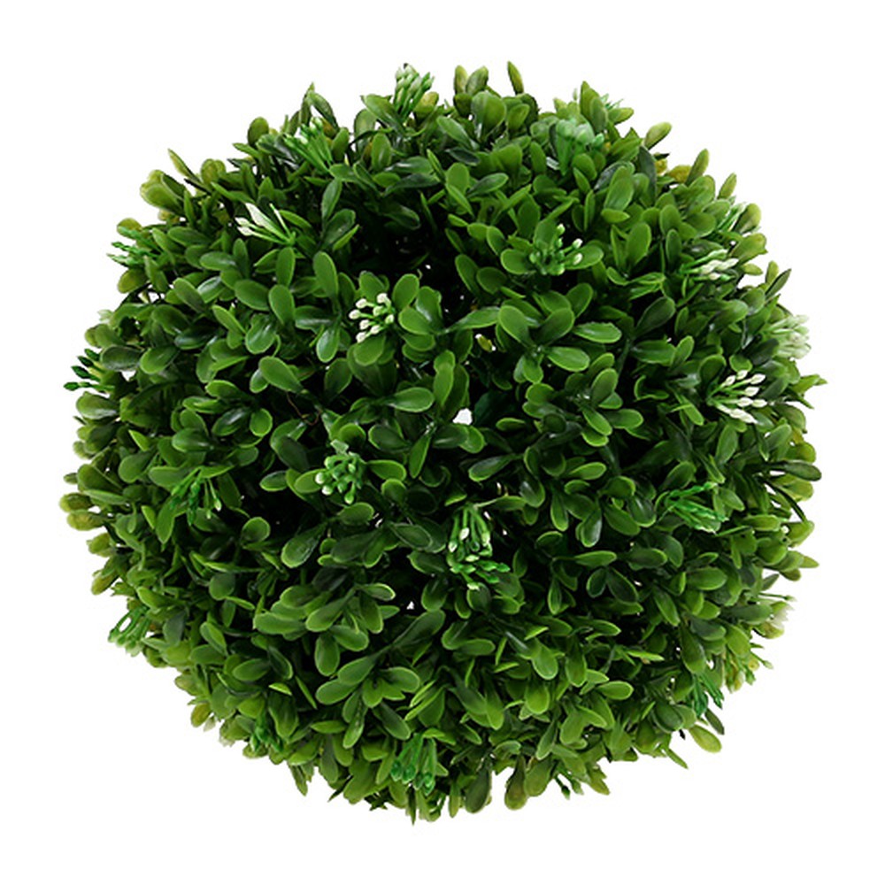 Dirbtinis buksmedžio rutulys yra maždaug 18 centimetrų skersmens ir pagamintas iš aukštos kokybės, oro sąlygoms atsparaus plastiko. Be sodrių žalių dirbtinio augalo lapų, visada galite pamatyti mažus, uždarus baltus žiedus, kurie tiesiogine prasme suapvalina bendrą dekoratyvinio augalo vaizdą.