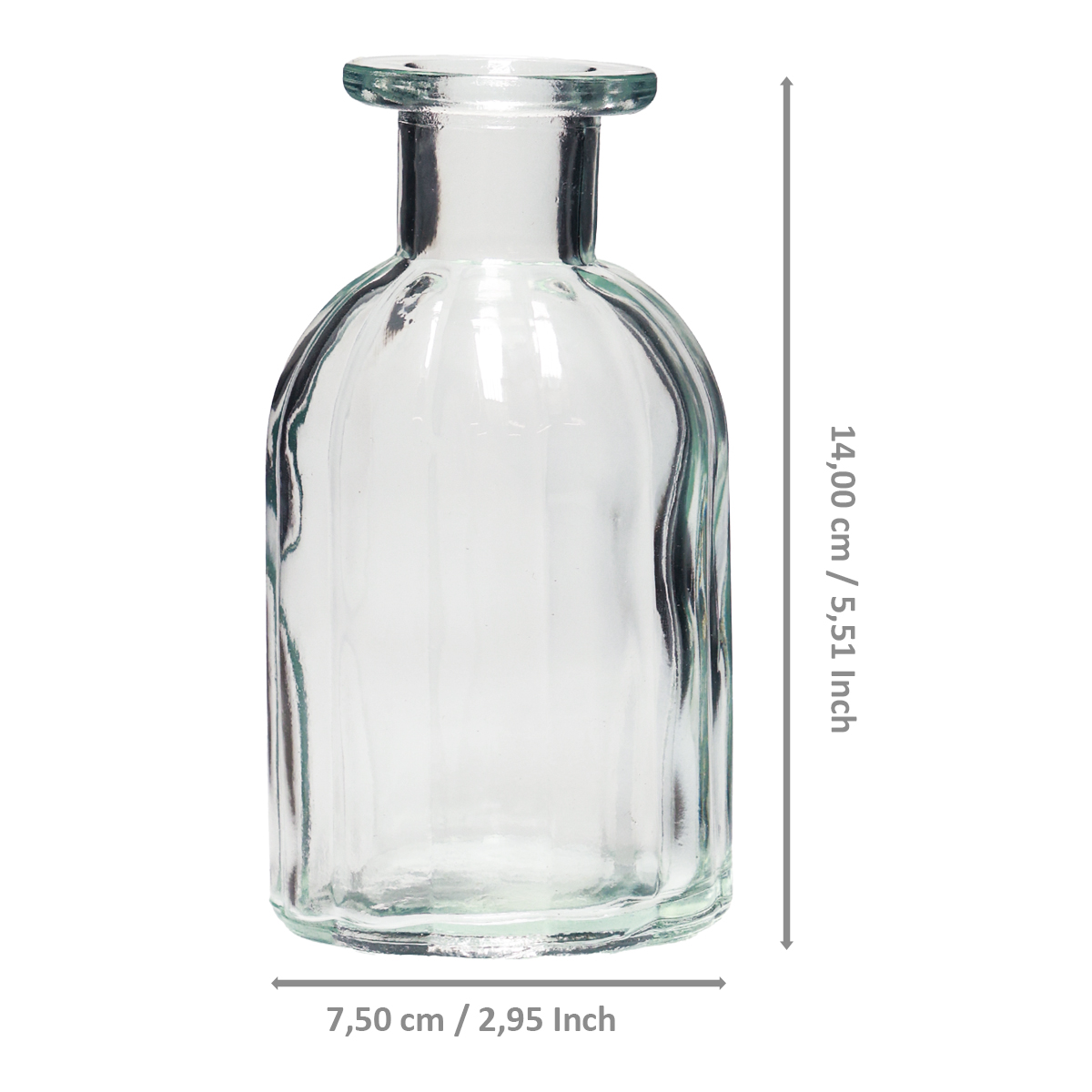 Mūsų parduotuvėje galite rasti ir didesnę butelio vazą. Mažos stiklinės vazos dekoracijos yra apie 14 centimetrų aukščio ir apie 7,5 centimetro skersmens.