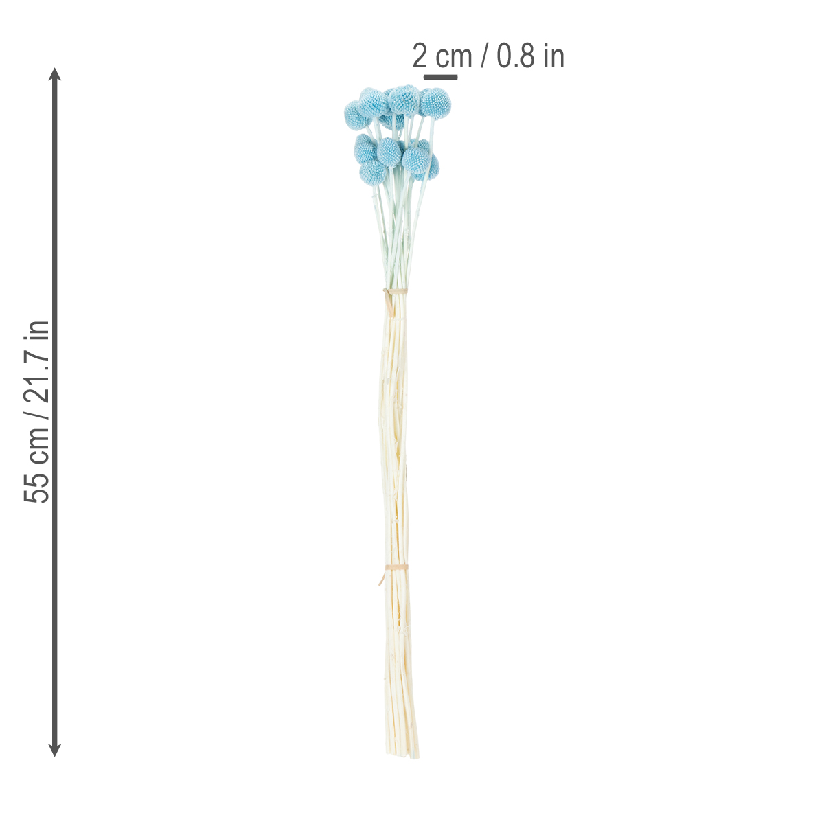 Intensyvios mėlynos spalvos ir 55 centimetrų ilgio šios džiovintos Craspedia gėlės yra tikras bet kurios vazos akcentas. Gėlių galvutės yra dviejų–trijų centimetrų skersmens, todėl šiai gėlių dekoracijai būdinga žavinga, tačiau subtili tekstūra. Jos puikiai tinka minimalistinėms vazoms arba kaip kūrybingas gėlių kompozicijų papildymas. Nesvarbu, ar ieškote modernios džiovintų gėlių dekoracijos savo svetainei, ar norite sukurti spalvingas stalo kompozicijas šventei, ar planuojate originalų „pasidaryk pats“ projektą – su šiomis Craspedia gėlėmis visada pasieksite stilingą vaizdą.