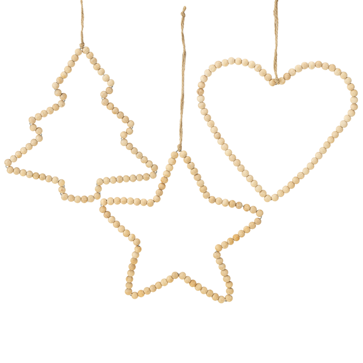 Deco kabykla kalėdiniai mediniai karoliukai širdelės žvaigždutė H20cm 3vnt