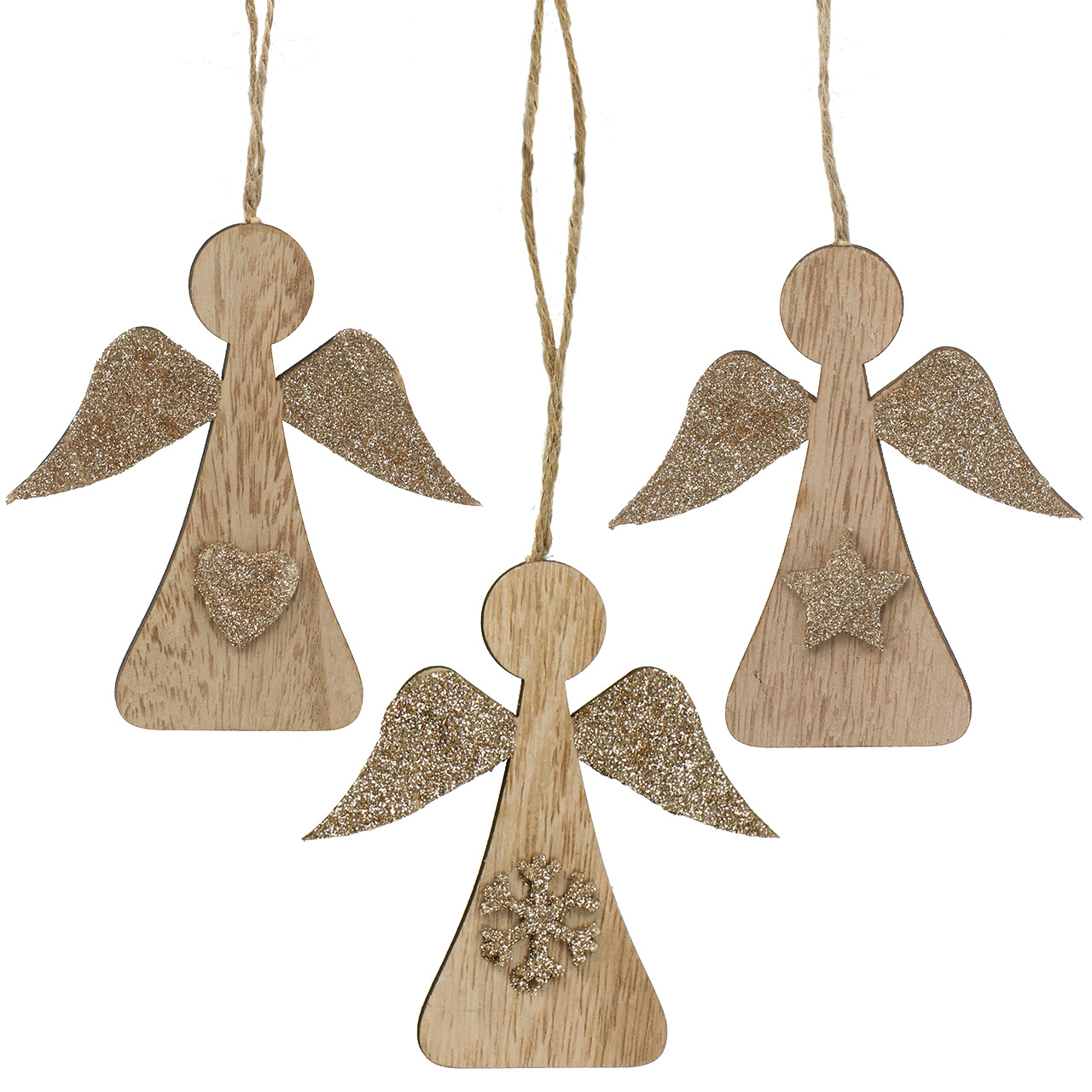 Kaip tik jūsų šventiniam papuošimui artėjant Kalėdoms: dvylika mažų dekoratyvinių pakabų iš kokybiško prekės ženklo VIANA yra stilizuotų angelų figūrėlių pavidalu. Angelai pagaminti iš natūralios medienos. Auksu dekoruoti sparnai ir auksine žvaigždute ant kūno tarnauja kaip žvilgantys akcentai. Su jau pritvirtinta džiuto virvele galite lengvai pakabinti medinius angelus.