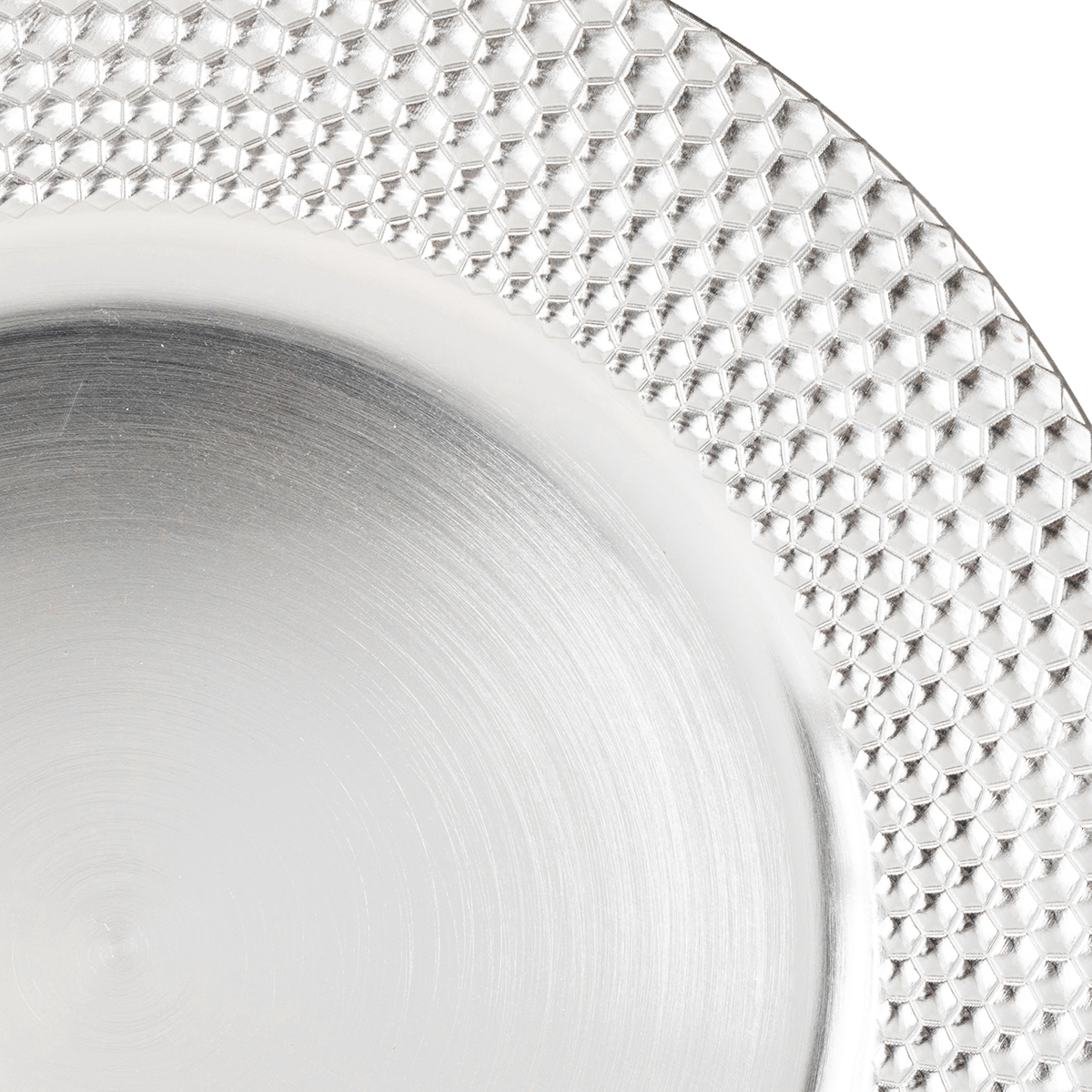 Tačiau būtent šešiakampis raštas ant krašto patraukia lėkštę akį. Sidabro spalva dekoratyvinei lėkštei suteikia puikų spindesį. Apatinė dalis lieka neapdorota juoda.