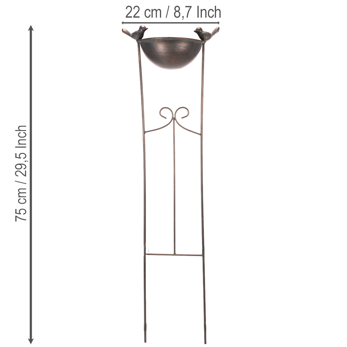 Ši paukščių girdykla stilingai derina funkcionalumą ir dizainą. 75 centimetrų aukščio ir 22 centimetrų skersmens, su harmoningais, nostalgiškais papuošimais, šis dekoratyvinis elementas puikiai dera prie jūsų sodo. Žavingi maži metaliniai paukšteliai dubens šonuose ir meniški vynmedžių ornamentai pabrėžia jo vintažinį charakterį ir suteikia jūsų sodui pasakos atspalvį. Naudokite paukščių girdyklą kaip praktišką paukščių girdyklą arba kaip vazoną savo kūrybiškiausioms idėjoms įgyvendinti. Ypač šiltuoju metų laiku galite komponuoti spalvingas gėles, dekoratyvinius akmenis ar plaukiojančius augalus, kad sukurtumėte unikalų sodo akcentą. Dėl grotelių šis aksesuaras taip pat idealiai tinka elegantiškai eksponuoti vijoklinius augalus, tokius kaip raganės ar gebenės. Aukštos kokybės metalinė konstrukcija su rafinuota bronzine apdaila daro paukščių girdyklą iš dalies atsparią oro sąlygoms ir suteikia jai ypač elegantišką išvaizdą. Valyti nepaprastai paprasta: tiesiog nuplaukite dubenį švariu vandeniu, kad jis išlaikytų blizgesį ilgus metus.