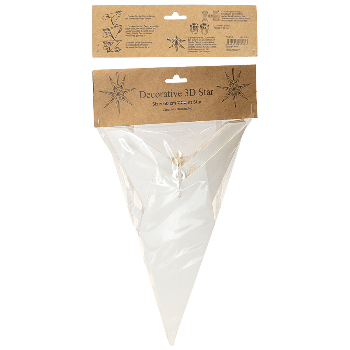 Ši popierinė žvaigždė ne tik traukia akį, bet ir žavi savo aukšta gamybos kokybe. Kreminės spalvos popierius spinduliuoja malonų paprastumą, kuris kartu yra ir elegantiškas. 60 cm skersmens žvaigždė idealiai tinka papuošti didesnius langus, bet ir ištisus kambarius – nesvarbu, ar tai būtų svetainės puošmena virš stalo, ar langų dekoracija su atmosferiniu apšvietimu, ar akcentas prieškambaryje. Integruotas medvilninis pakabukas su virvelės kamščiu leidžia lengvai pakabinti ir užtikrina saugų laikymą.