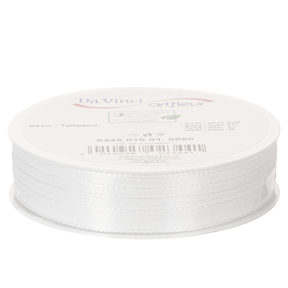 Dekoratyvinė taftos juostelė, balta, 10 mm pločio, 50 m ilgio