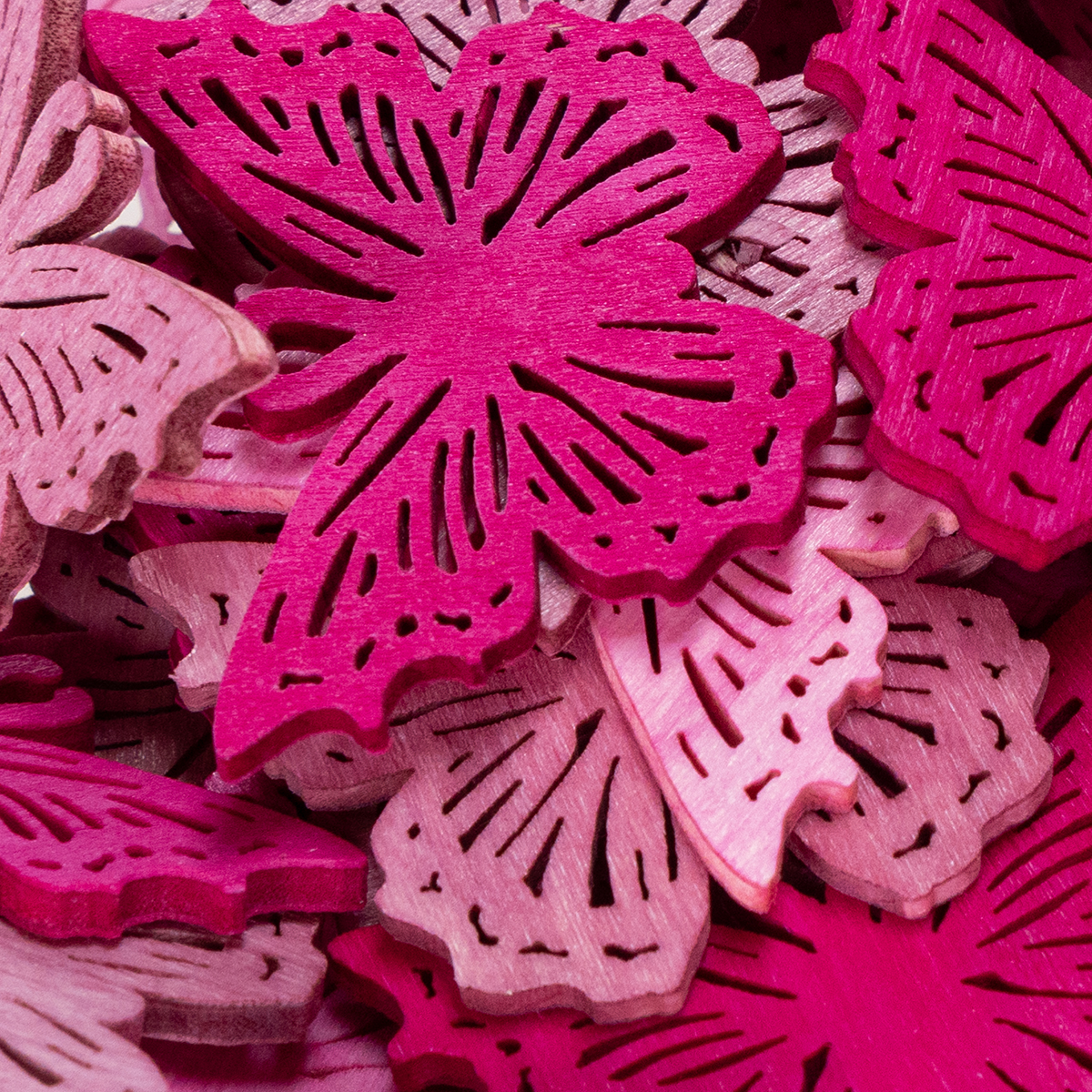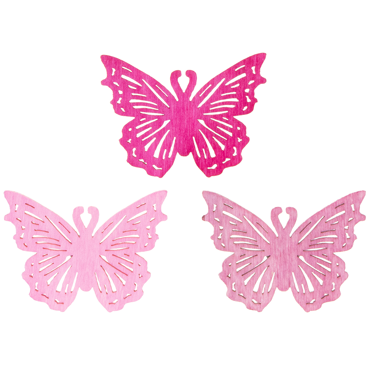 Šie drugelių formos dekoracijos, pagamintos iš puikios medienos, yra 4 cm dydžio ir parduodamos patogioje 72 vienetų pakuotėje. To pakanka papuošti kelis stalus, dubenis ar net didesnius stendus. Rožinės, rožinės ir alyvinės spalvų gama yra subtili ir pavasariška – tikras akį traukiantis paveikslas, kuris nėra nei ryškus, nei nuobodus. Tiems, kurie mėgsta natūralesnį vaizdą, patiks smulkiai grūdėta mediena ir subtilus sparnų dizainas. Drugeliai ypač tinka prie modernaus ir klasikinio dekoravimo stilių, bet taip pat puikiai dera ir „shabby chic“ ar kaimiško stiliaus aplinkoje.