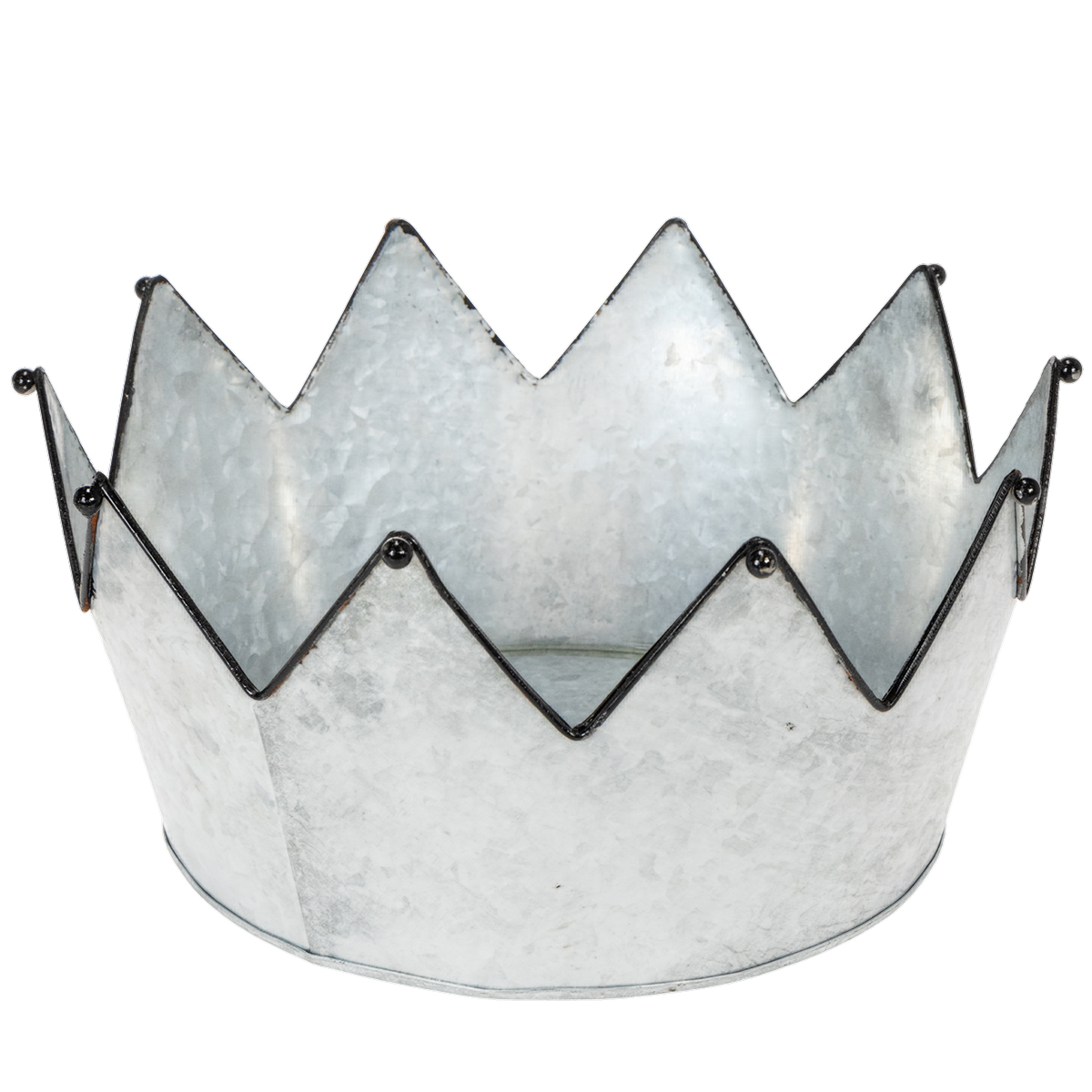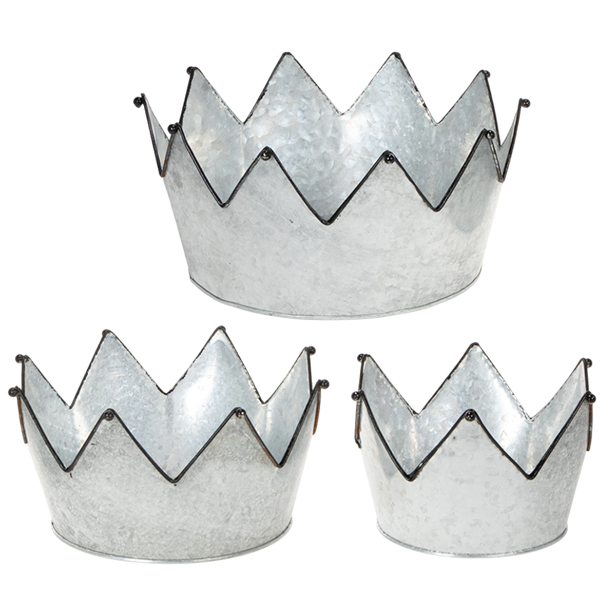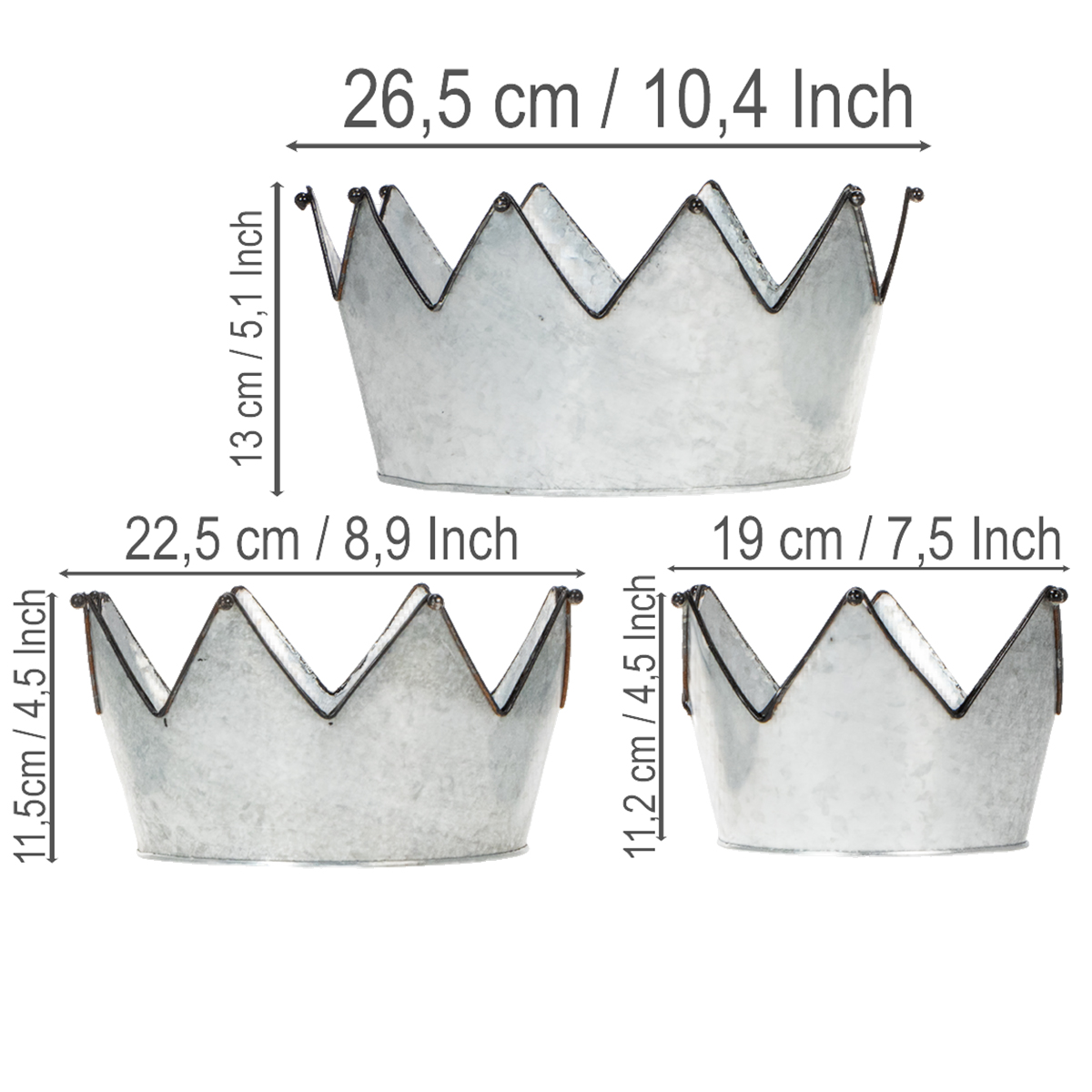 Trys metaliniai dubenys iš cinko gaminami skirtingų dydžių. Bendra juos turi juodas apvadas aplink smaigalius, kuriuos puošia nedidelis dekoratyvinis rutulys. Rutulys taip pat yra juodas, kad atitiktų vintažinę dekoraciją. Juodas apvadas su puošmena visiems leidžia suprasti: čia yra trys karūnos – paruoštos užpildyti arba tiesiog uždėti.