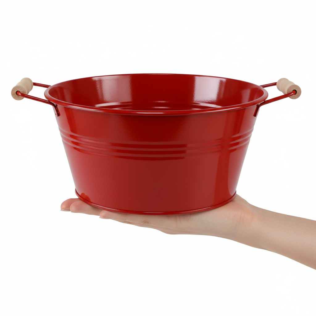 Šis gėlių dubuo spindi gražiausia raudona spalva. Klasikinę formą ištobulina rankenos su tikromis medinėmis rankenomis. Metalo apdaila atrodo harmoningai ir nostalgiškai.