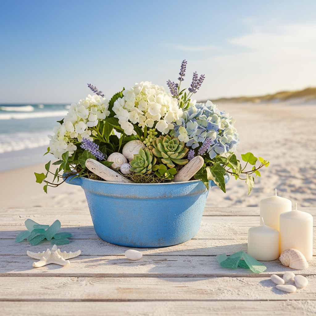 Metalo apdaila taip pat gražiai atrodo su dekoratyviniais akmenimis arba smėliu ir sukulentais. Dėl spalvų schemos sėjamoji puikiai tinka bet kokiai jūrinei dekoracijai. Papuoškite dubenį smėliu, džiovintomis gėlėmis, kriauklėmis ir dreifuojančia mediena. Taip metalinis kachepotas tampa darnia stalo puošmena.