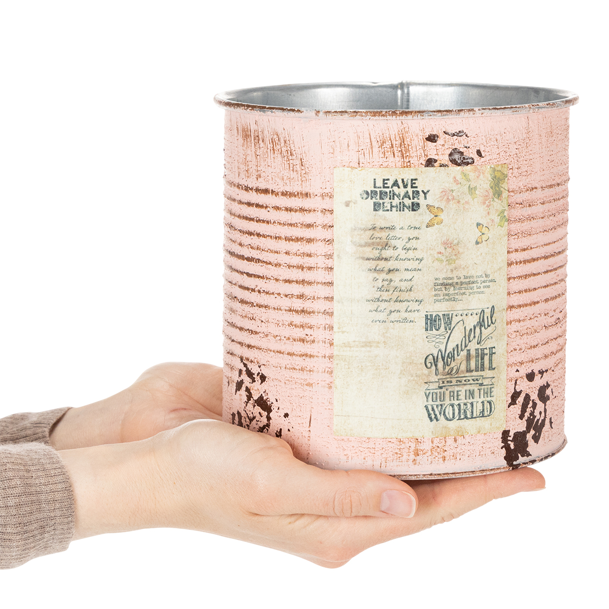 Šis lašišos spalvos gėlių vazonas iš dekoratyvinės skardos padaro vasarą spalvingą! Kruopščiai nudažytas rūdžių purškimu ir pasirinkta pasteline spalva, metalinis indas gali būti naudojamas kaip vazonėlis ar sodinukas. Senovinis lipdukas pabrėžia rafinuotą, nostalgišką skardinės išvaizdą. Tai, kad metalinė apdaila iš tikrųjų visiškai nauja, matyti tik iš sidabro spalvos vidaus. Žinoma, ši dėžutė, kuri yra specialiai pagaminta kaip sodintuvas, neturi aštrių kraštų viduje.