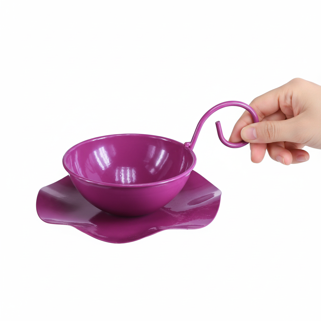 Pradžiuginkite savo gėles violetiniu metaliniu dekoratyviniu puodeliu. Šis arbatos puodelis suteiks spalvų jūsų dekoravimui kaip gėlių dubenėlis pavasarį ir vasarą! Maždaug 11,5 cm skersmens ir 8 cm aukščio jis puikiai tinka įvairiems dekoratyviniams tikslams – tiek patalpoje, tiek vasaros sode. Violetinė spalva dvelkia paslaptinga elegancija ir puikiai dera su natūraliais pasteliniais tonais ar ryškiomis akcentinėmis spalvomis, o tai atveria daugybę kūrybiško dizaino galimybių. Ypač verta dėmesio elegantiškai išlenkta rankena ir prie puodelio pritvirtinta banguota gėlės formos lėkštė, kuri ne tik patraukli vizualiai, bet ir funkcionaliai. Šis purpurinis lakuotas dekoratyvinis puodelis yra dviejų rinkinių ir yra būtinas kiekvienam, kuris nori praturtinti aplinką skoningais akcentais.