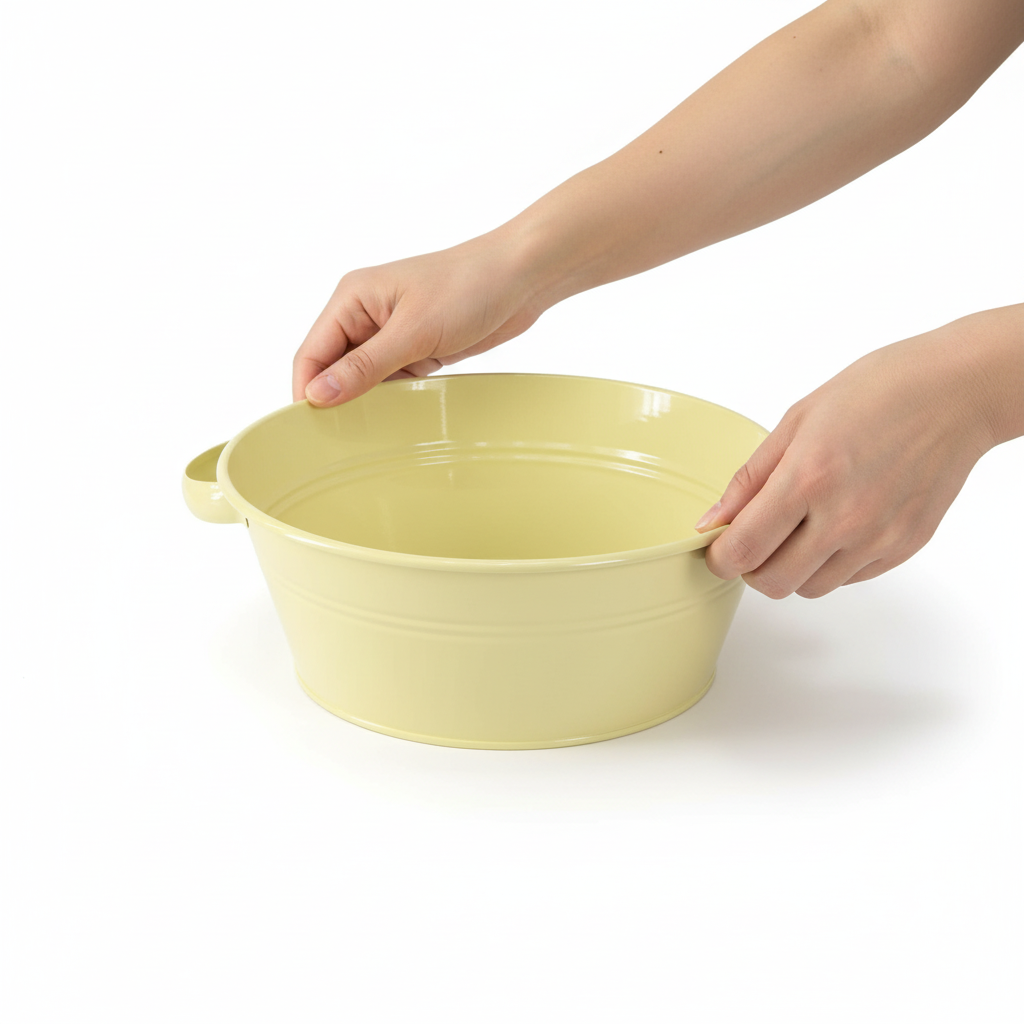Šis apvalus metalinis dubuo sujungia elegantišką retro stiliaus dizainą ir didelį funkcionalumą. Idealiai tinka kaimo namams ar skurdžiam prašmatniam interjerui, jis žavi savo tvirtu apdirbimu ir subtilia žalsvai geltona spalva.