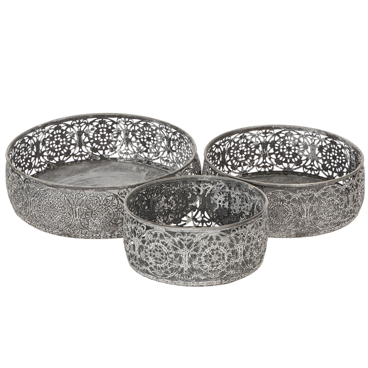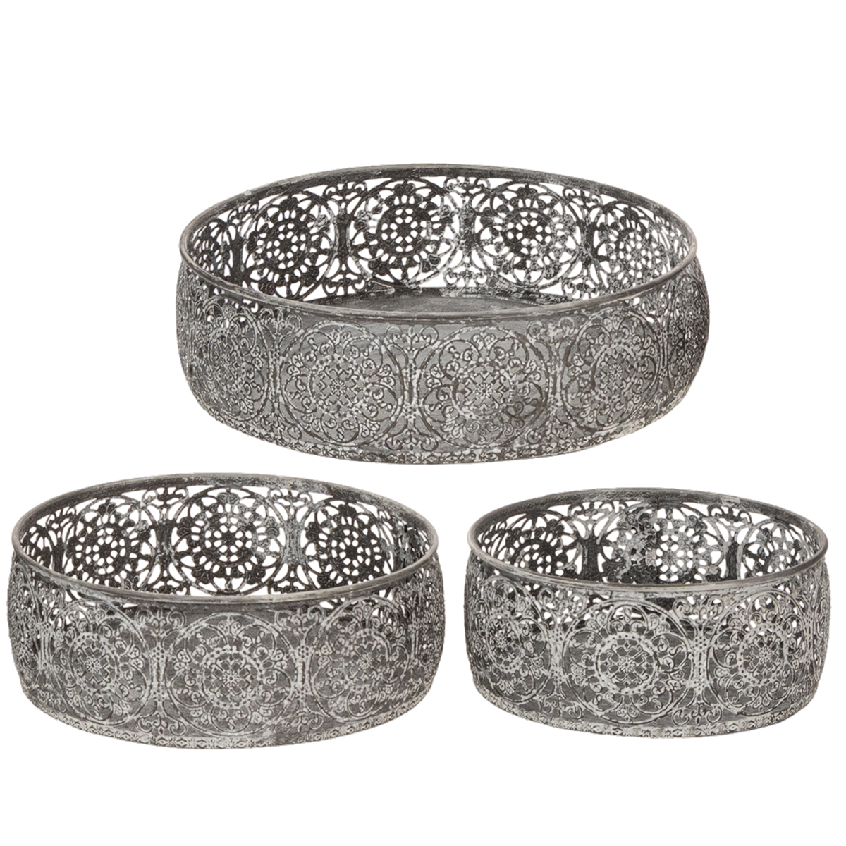 Dekoratyvinis metalinis dubuo, pilkai baltas raštas, Ø16/19,5/23,5 cm, 3 vnt. rinkinys