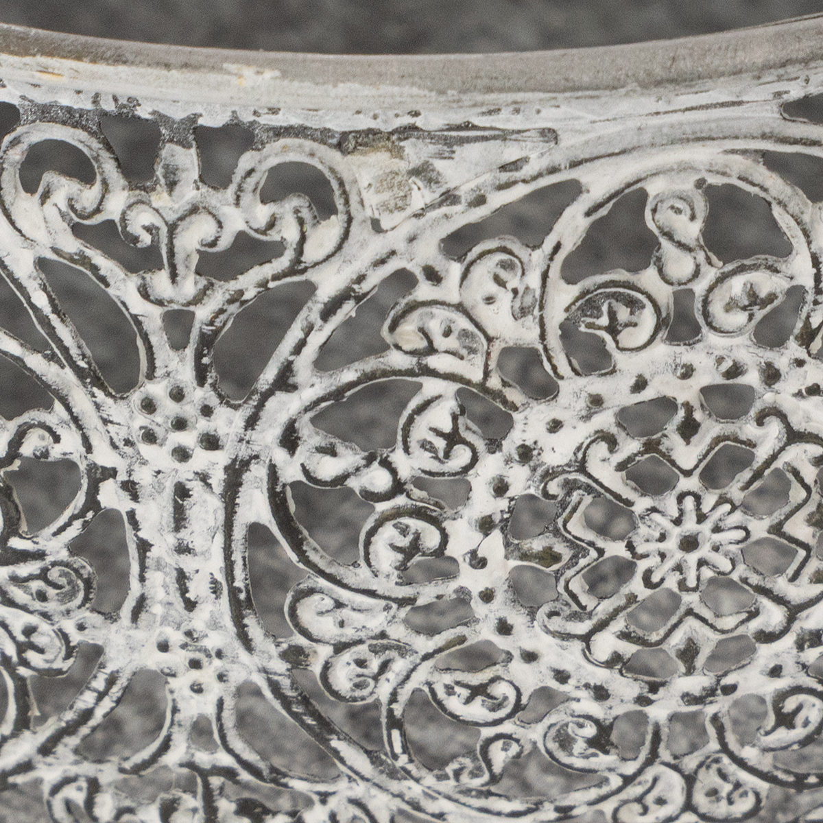 Gėlių raštai ir nesenstanti sidabrinė pilka spalva paverčia baltai išplautą dekoratyvinį dubenį nuostabia vintažine puošmena.