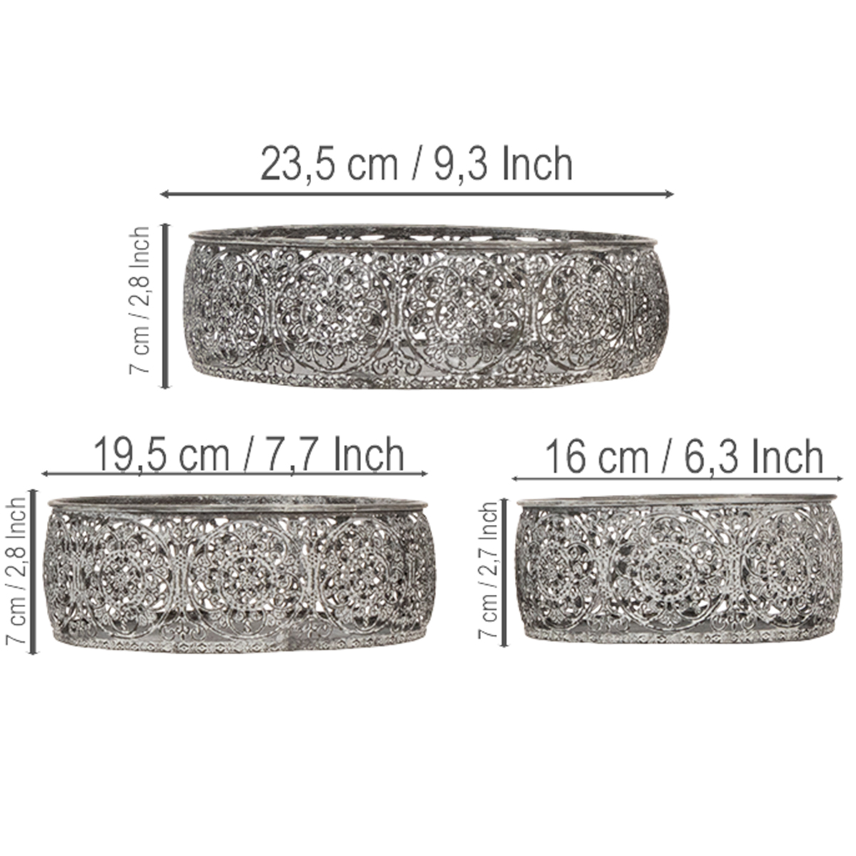 Trys skirtingo skersmens apvalūs dubenys gali būti naudojami įvairiais būdais dekoravimo idėjoms. Sidabrinė-pilka kartu su baltu skalbiniu puikiai dera su šviesiais ar pilkais dekoratyviniais akmenimis, ant kurių galėtų stovėti baltos ar antracito spalvos žvakės. Tris dekoratyvinius dubenėlius taip pat galite naudoti kaip dekoratyvinę savo mažų lobių saugyklą.