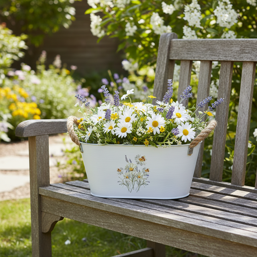 Ant ovalaus metalinio dekoratyvinio dubenėlio žydi baltos ramunės ir violetinės levandos. Bitės lanko gėles. Dvi džiuto rankenos meistriškai užbaigia natūralų vaizdą ant balto metalinio dubenėlio.