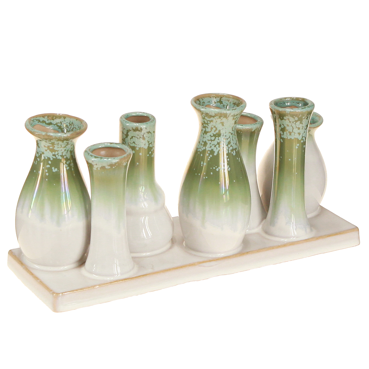 - 7 dekoratyvinių keraminių vazų rinkinys ant tvirto padėklo