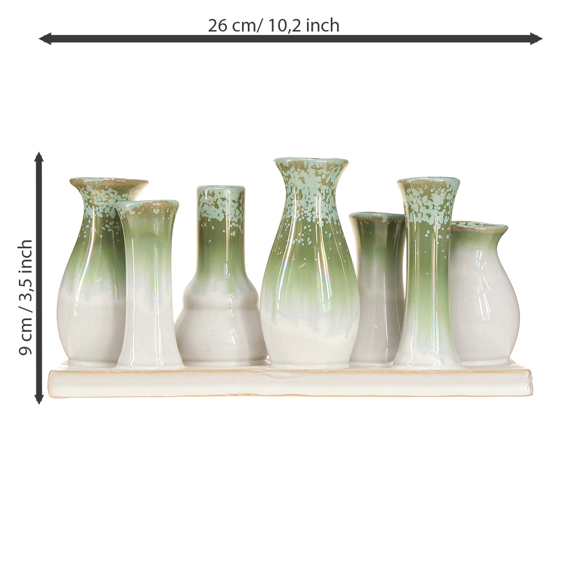 Šis septynių mažų dekoratyvinių keraminių vazų rinkinys ant derančios spalvos padėklo greitai taps jūsų interjero akcentu. Harmoningi žali ir balti tonai primena skandinaviško dizaino natūralumą ir puikiai dera prie minimalistinio ar kaimiško stiliaus. Vazos yra skirtingų formų, todėl kreminė spalva suteikia vizualinio patrauklumo. Šis rinkinys, nesvarbu, ar sudėliotos grupėje, ar atskirai, atveria begales dizaino galimybių.
