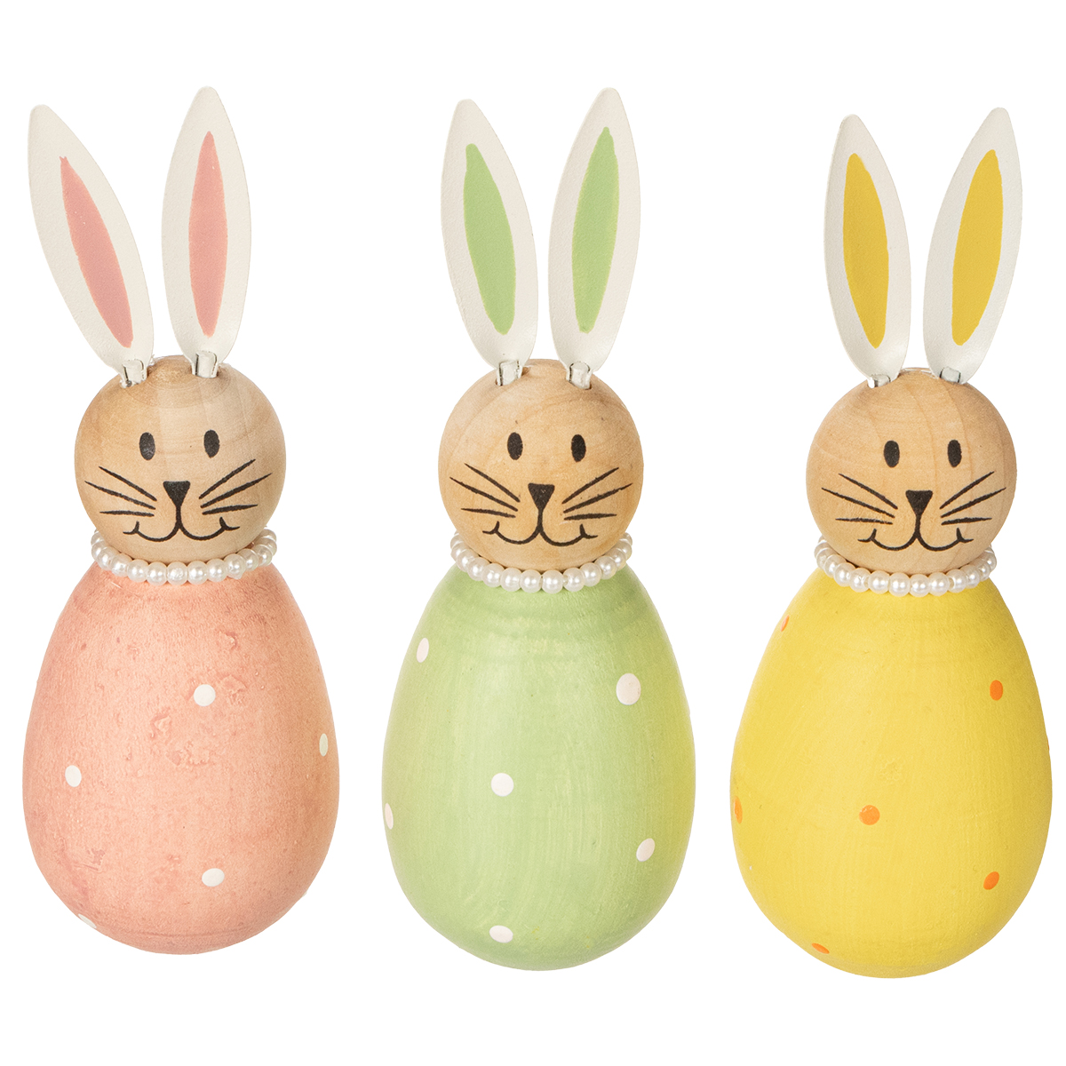 Šios dekoratyvinės triušių figūrėlės iš pirmo žvilgsnio stebina savo žavingu dizainu ir aukštos kokybės meistriškumu. Pagamintos iš tvirtos medienos, jos yra ne tik patvarios, bet ir nesenstančios. Natūralių medžiagų ir švelnių spalvų derinys sukuria patrauklų vintažinio žavesio ir modernaus elegancijos derinį. Kiekvienas triušis yra unikaliai sukurtas: pastelinių spalvų kiaušiniai papuošti subtiliais taškeliais, o judančios metalinės ausys ir mieli perlų vėriniai suteikia papildomo žavesio. Rankomis tapyti zuikučių veidai įkvepia jiems gyvybės ir paverčia juos žavinga bet kurio kambario puošmena. Figūrėlės gali būti nuostabiai derinamos su kitomis dekoracijomis, ypač ant Velykų stalo – nesvarbu, ar tai būtų gėlių kompozicijos, maži krepšeliai, pripildyti kiaušinių, ar kitos pavasarinės dekoracijos. Jos taip pat suteikia gaivumo kaip palangių dekoracijos arba kaip atskiri elementai lentynoje. Tie, kurie vertina universalumą, pamils šias triušių figūrėles: jos vienodai gerai tinka tiek kaimiško stiliaus, tiek klasikinėms Velykų dekoracijoms. Jos ypač gražiai atrodo derinamos su kitais pastelinių spalvų elementais, tokiais kaip subtilios žvakidės ar mažos vazos su pavasario gėlėmis. Jūsų kūrybiškumui nėra ribų!