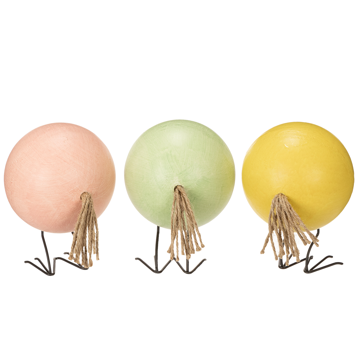 Būkime atviri – kokios gi būtų Velykos be linksmos dekoracijos, praskaidrinančios mūsų namus? Šis žavus trijų dekoratyvinių viščiukų rinkinys įneš pavasario dvelksmą tiesiai į jūsų gyvenamąją erdvę. Šios mažos viščiukų figūrėlės, pasižyminčios mediniais kūneliais ir mielomis metalinėmis kojelėmis, pastelinių geltonos, rožinės ir žalios spalvos atspalvių tikrai privers jus nusišypsoti. Žaismingas, minimalistinis dizainas leidžia jas puikiai derėti ant bet kurios lentynos svetainėje, kaip valgomojo stalo puošmeną ar ant palangės biure.