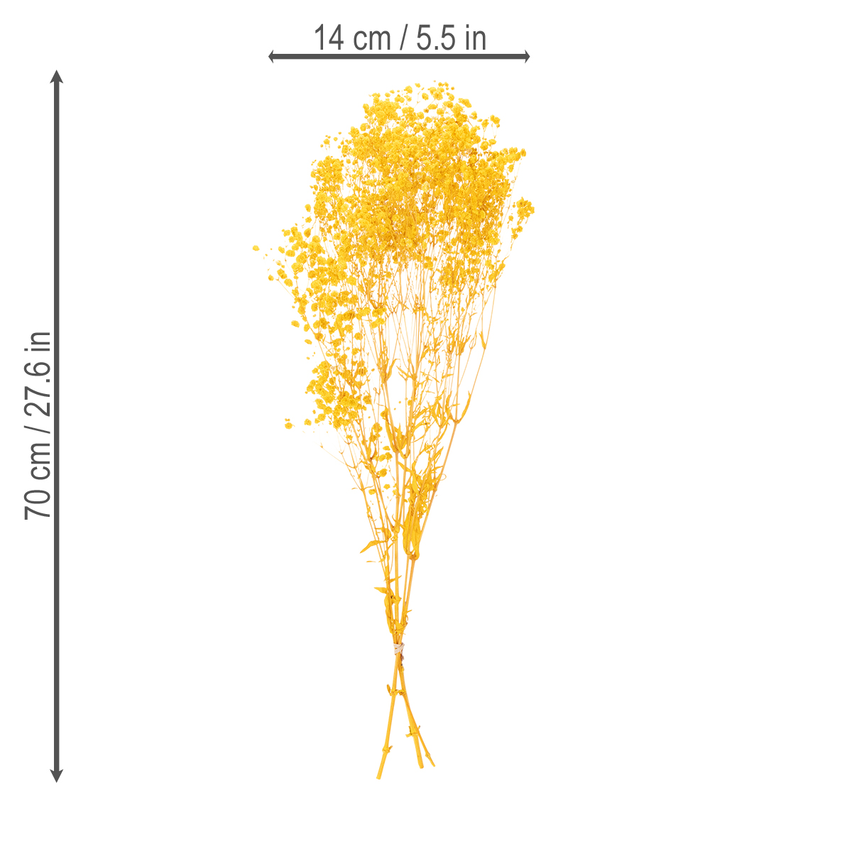 Kūdikio kvėpavimas simbolizuoja lengvumą ir eleganciją, o šioje puokštėje jis prideda linksmą šiltos geltonos spalvos purslą. Pagaminta iš tikrų, kruopščiai džiovintų gėlių, ši puokštė idealiai tinka vidaus patalpoms arba dengtoms lauko erdvėms.