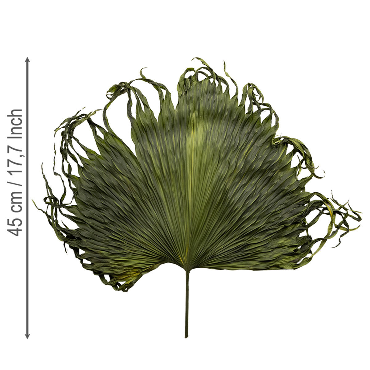 Vešlūs žali, džiovinti skėtinės palmės lapai suteikia egzotiško elegancijos įvairiems stiliams – tiek bohemiškam, tropiniam, tiek miesto džiunglių stiliui. Maždaug 45 cm skersmens lapai puikiai tinka stiklinei lėkštei su egzotiškomis dekoracijomis, tačiau juos taip pat galima naudoti įmantresnėse dekoracijose ir „pasidaryk pats“ projektuose. Norėdami natūralesnio vaizdo, galite juos išdėstyti horizontaliai ir naudoti kaip stalo ar indaujos centrines detales.