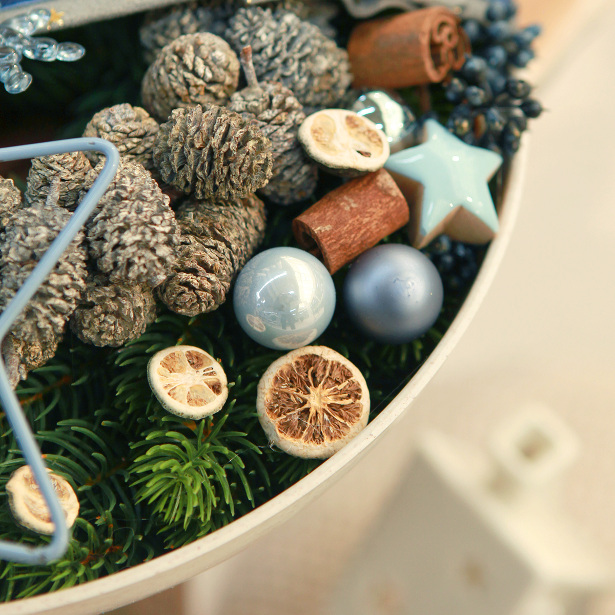 Medžiagos: natūralios medžiagos, tokios kaip kūgiai, mediena, žievė, samanos, šakelės, lapai, džiovintos gėlės, jūros dumbliai ir kokoso pluoštas.