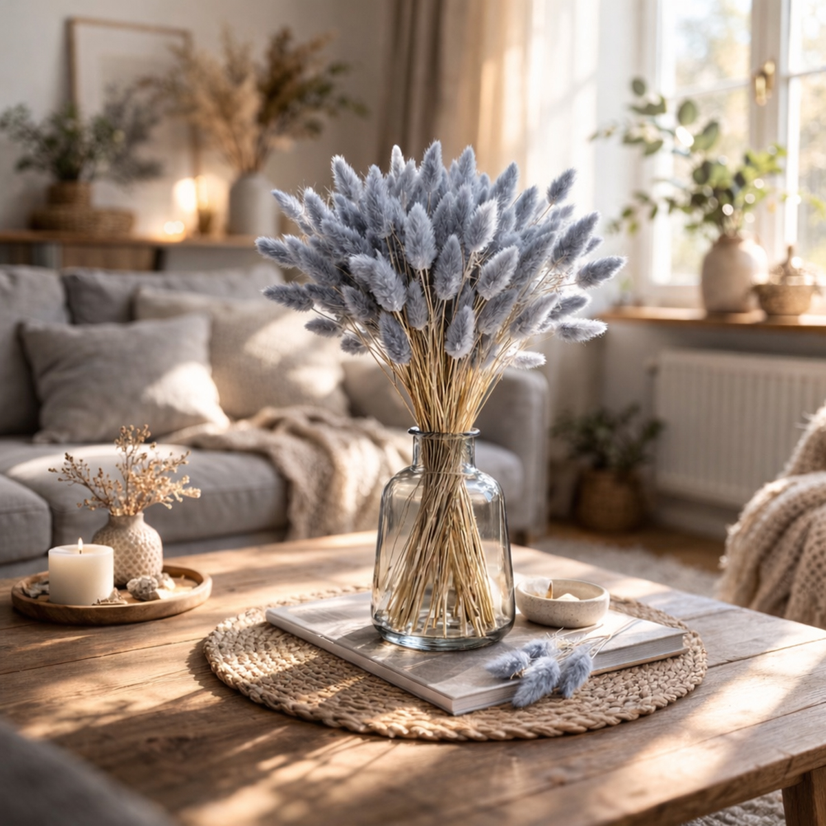 - Natūralus dekoras skandinavišku stiliumi: derinkite triušio uodegos žolę su šviesiais medžio tonais ir minimalistiniais aksesuarais.