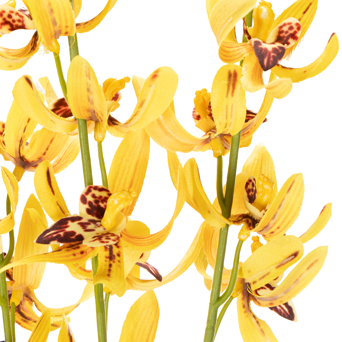 Cymbidium orchidėja laikoma elegancijos ir rafinuotumo simboliu. Dėl aukštos kokybės gamybos ji yra praktiškai nesunaikinama, tačiau kartu ir tikrai traukia akį. Geltono šilko audinio, suteikiančio autentiškumo pojūtį, ir lanksčio plastikinio kotelio derinys daro ją ne tik vizualiai patrauklią, bet ir praktišką jūsų kūrybiniams projektams. Naudokite ją didelėms vazoms papuošti arba derinkite orchidėją su žaliomis šakelėmis ir kitomis dirbtinėmis gėlėmis, kad sukurtumėte įspūdingas kompozicijas.