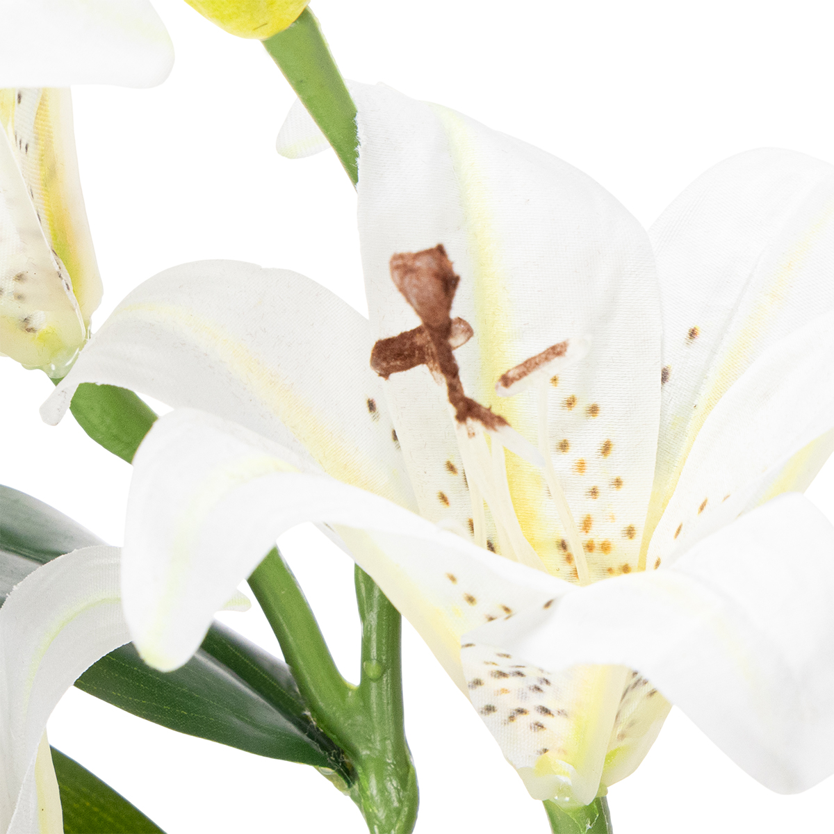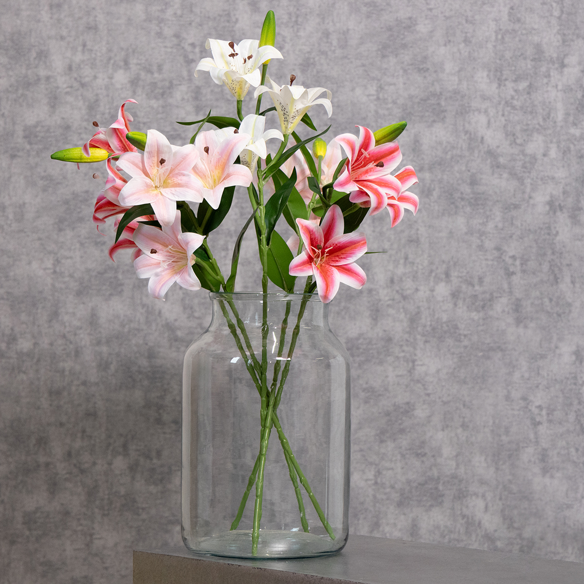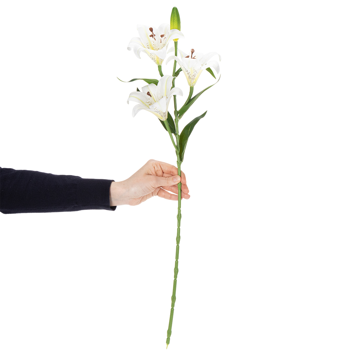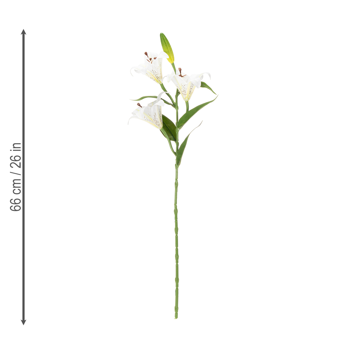 Šios aukštos kokybės dirbtinės lelijos žavi savo tikrovišku dizainu ir subtiliu žavesiu. Jos puikiai tinka minimalistiniam svetainės interjerui paryškinti, bet taip pat atrodo stulbinamai romantiškame kaimiškame stiliuje. 66 cm aukščio gėlės gali būti įkomponuotos į vazas, taip pat į didesnes kompozicijas. Poliesteris ir plastikas užtikrina natūralią išvaizdą ir malonų pojūtį.