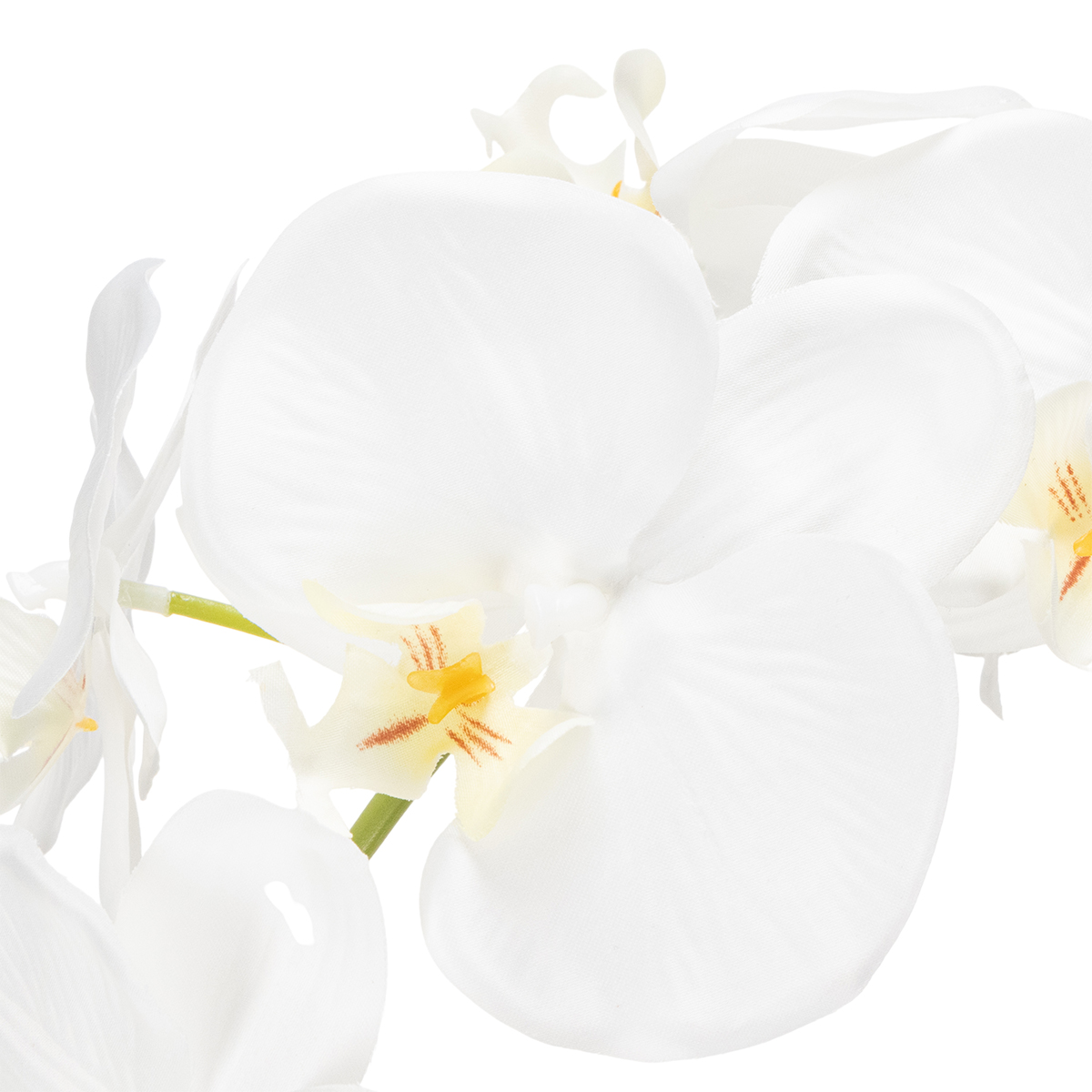 Ypač įtemptoje aplinkoje, pavyzdžiui, prie biuro stalo ar posėdžių salėje, orchidėja atskleidžia savo ypatingą efektą. Jos spindinti balta spalva suteikia kambariui ramybės ir harmonijos, o realistiška išvaizda perkelia gamtą į vidų be laistymo ar išdėstymo. Nesvarbu, ar ji stovi lentynoje, koridoriuje ar net vonios kambaryje – ši orchidėja visur suteikia ypatingo žavesio.