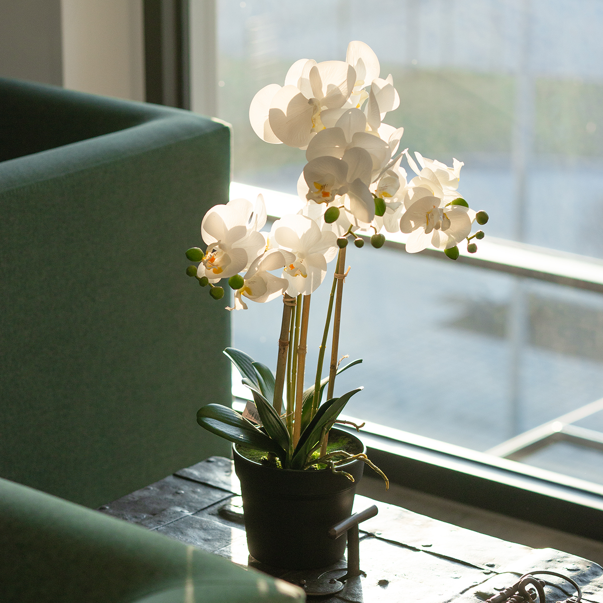 Mūsų aukštos kokybės dirbtinė orchidėja lengvai suteiks jai stiliaus. Kompoziciją sudaro trys elegantiški baltai žydintys stiebai, papuošti mažais žaliais pumpurais. Viskas tvirtai laikosi juodame vazone, kuris diskretiškai dera prie bet kokio kambario dizaino. Dirbtinė gėlė pagaminta iš kruopščiai apdirbto audinio ir plastiko, todėl ji ne tik atrodo tikroviškai, bet ir yra patvari. Maždaug 25 cm pločio ir skersmens ji puikiai tinka svetainėse, biuruose ar stilingose priimamuosiuose.