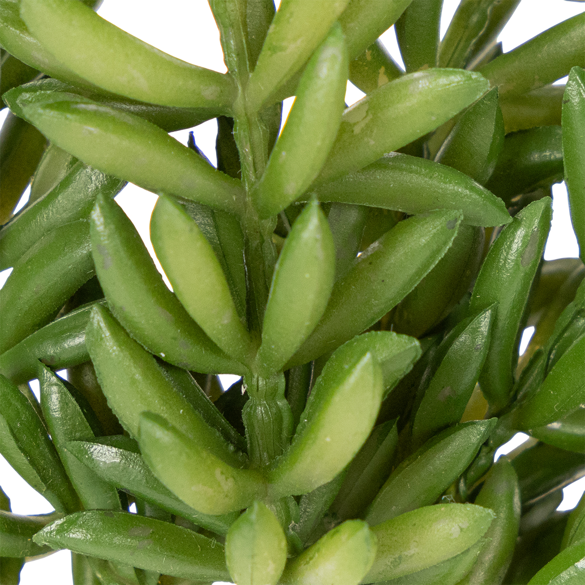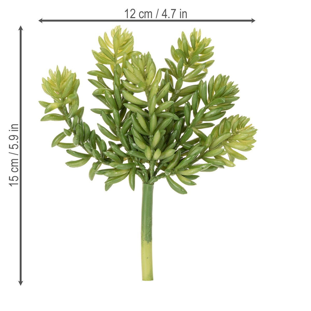 Mūsų dirbtinis sukulentas žavi ne tik realistišku dizainu, bet ir universalumu. Kruopštus detalumas ir sodri žalia spalva paverčia jį puikiu dekoratyviniu akcentu bet kuriame kambaryje. Storas, tvirtas stiebas užtikrina, kad augalas tilptų bet kokioje vazoje ar kompozicijoje, o šešiašakių šakų dėka augalas atrodo ypač natūraliai. Ši dirbtinė gėlė idealiai tinka ieškantiems nereikalaujančių priežiūros dekoratyvinių variantų. 15 cm aukščio ji puikiai dera ant lentynų, indaujų ar vitrinų. Kartu su kitais dekoratyviniais elementais, tokiais kaip mediniai dubenėliai, žvakidės ar minimalistinės stiklinės vazos, ji greitai sukuria harmoningą bendrą vaizdą. Ar jums labiau patinka modernus, ar skandinaviškas stilius? Šis sukulentas sklandžiai dera prie aplinkos ir garantuotai patrauks akį! Sukulentas taip pat palieka puikų įspūdį biure. Tokiose erdvėse kaip priimamieji, laukimo kambariai ar konferencijų salės vyrauja atpalaiduojanti atmosfera ir raminantys žali atspalviai. Ar norite pagražinti savo biuro aplinką nereikalaudami laiko priežiūrai? Šie dirbtiniai augalai siūlo puikų sprendimą.