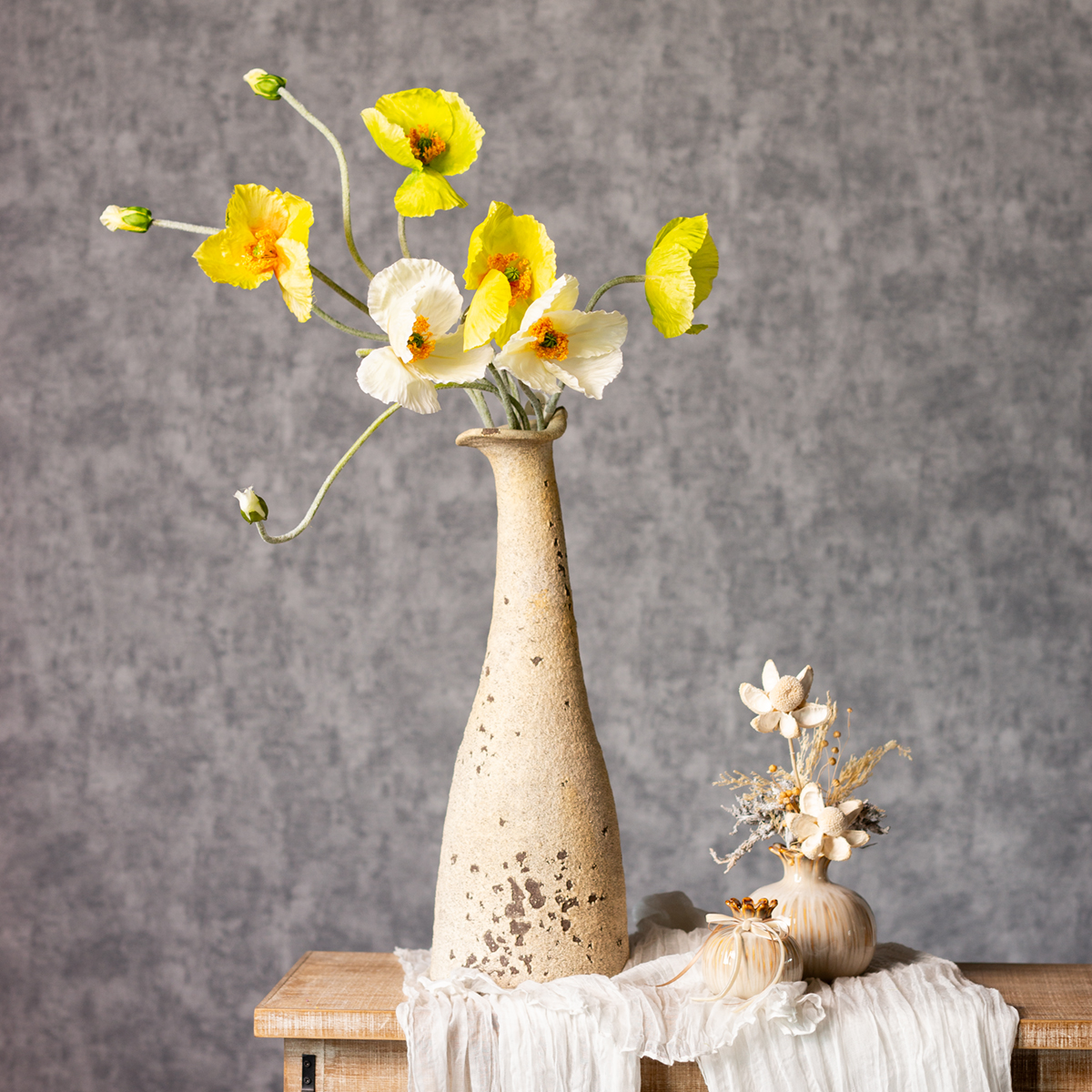 Ši 95 cm aukščio dirbtinių aguonų puokštė atrodys ryškiai bet kuriame kambaryje. Ryškiai geltoni žiedai, derinami su natūraliomis formomis ir grakščiai išlenktais stiebais, suteikia šiai kompozicijai stilingą ir modernų charakterį. Idealiai tinka šiuolaikinio interjero dizaino, skandinaviško stiliaus ar miesto džiunglių įvaizdžio gerbėjams. 30 cm skersmens ir 95 cm aukščio trijų stiebų rinkinys suteikia daug erdvės įvairioms dekoravimo idėjoms. Nesvarbu, ar jos išdėstytos atskirai paprastoje vazoje, ar derinamos su kitomis dirbtinėmis gėlėmis ir sukuriama sodri puokštė – galimybės neribotos! Aguonos ypač gerai dera su baltais ar žaliais akcentais. Poliesterio ir plastiko derinys užtikrina patvarumą, o žiedams ir lapams suteikia neįtikėtinai tikrovišką išvaizdą. Puikiai tinka tiems, kurie vertina natūralumą, bet nenori aukoti ilgalaikio šviežumo. Ir jokios varginančios priežiūros? Apie tai galite pamiršti!
