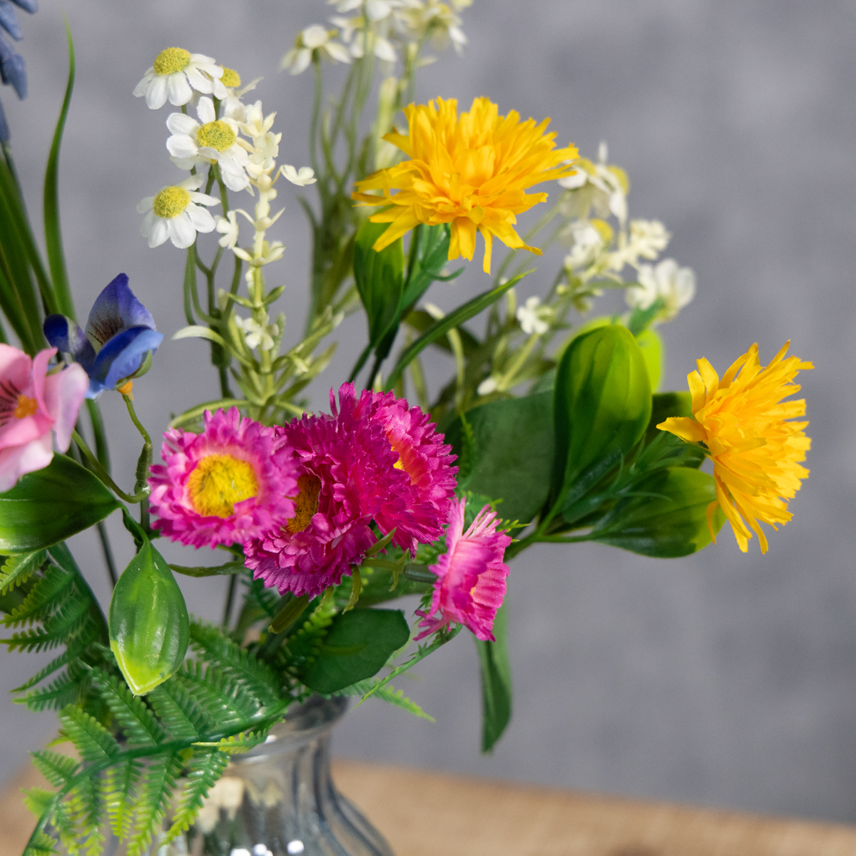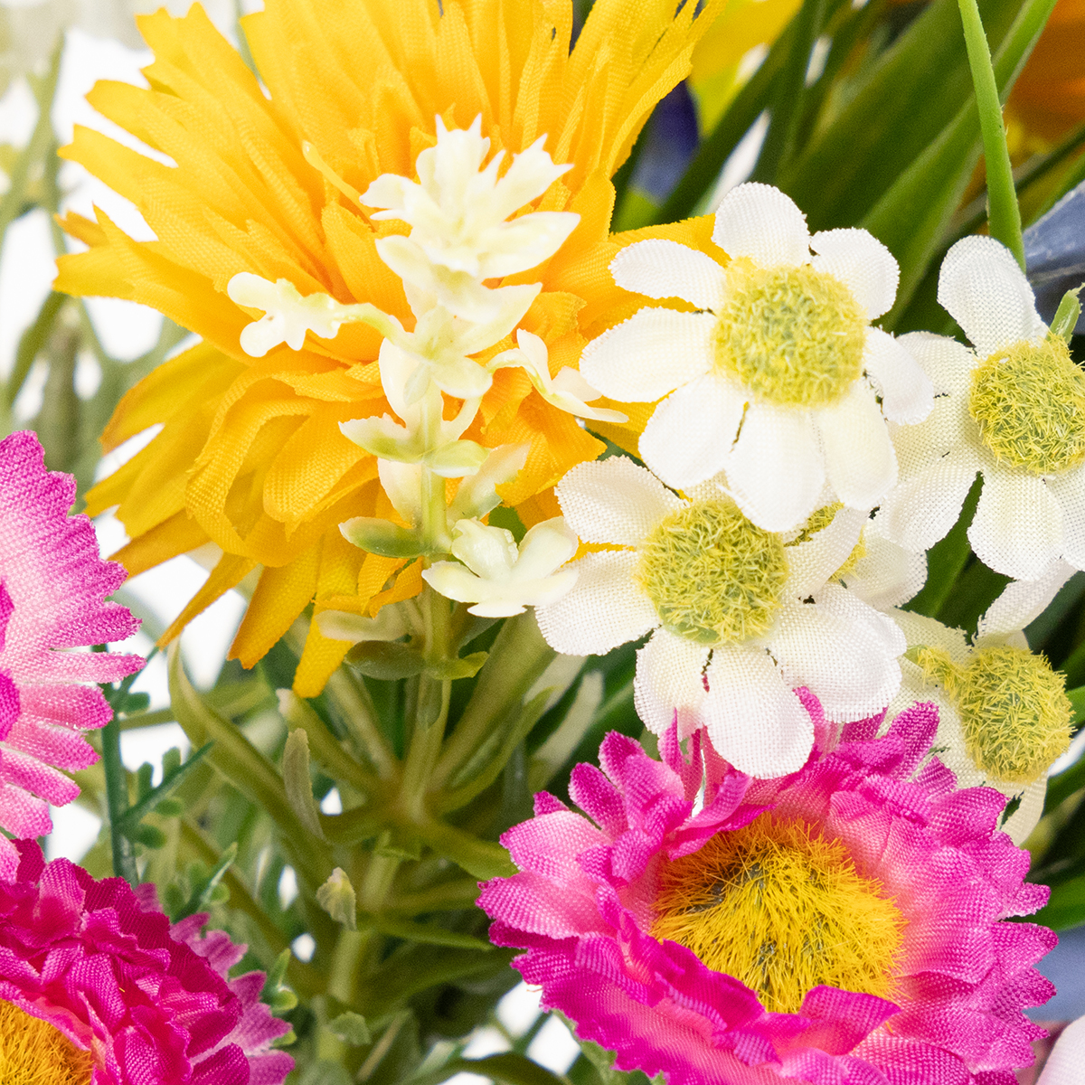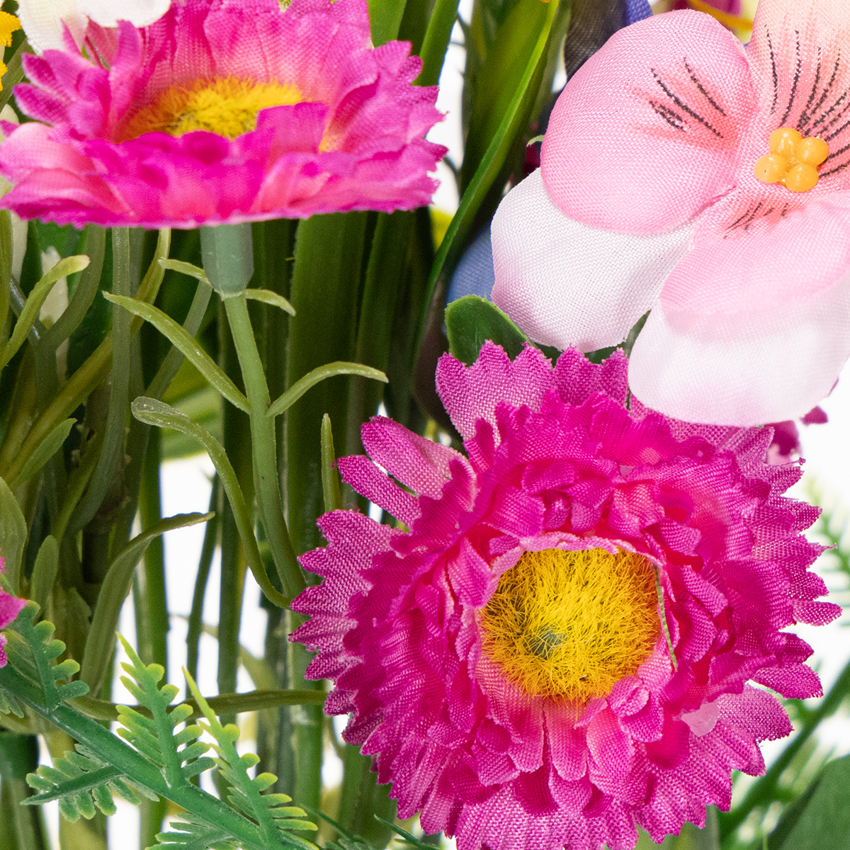 Ši ryškiaspalvė dirbtinių gėlių puokštė su detaliais, ryškių geltonos, rožinės ir mėlynos spalvos atspalvių žiedais įneša pavasario jausmą į jūsų namus. Pagaminta iš aukštos kokybės poliesterio ir plastiko, ji atrodo neįtikėtinai tikroviškai ir žavi išskirtiniu spalvų patvarumu bei formos išlaikymu. Spalvingos pavasarinės gėlės ir natūralių žalių atspalvių derinys daro ją ypač universalią: ji papildo kaimiško stiliaus interjerą, paryškina skandinavišką dekorą ir puikiai dera su moderniu dizainu.