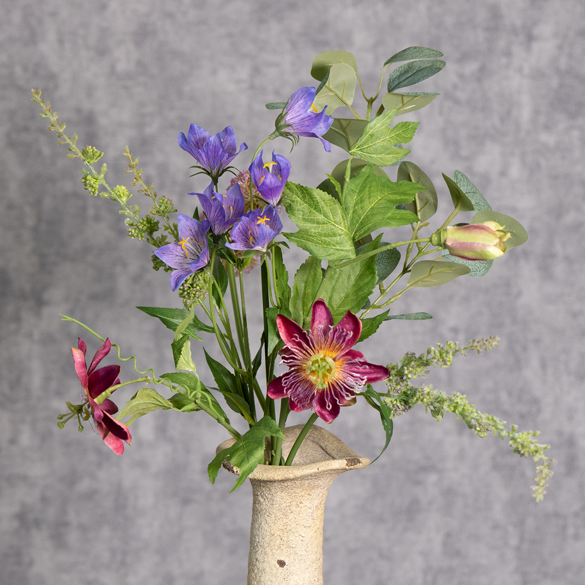 Mūsų dirbtinių gėlių puokštė – tai duoklė natūraliam žiedų spindesiui, tobulai atkurtai iš aukštos kokybės plastiko. Su meile pagamintos violetinės, raudonos ir žalios spalvos gėlės yra tikras akį traukiantis kūrinys. Kiekvienas žiedas, nesvarbu, ar tai būtų subtilūs pavasario žiedai švelniai alyvinės spalvos, ar ryškiai raudoni akcentai, yra kruopščiai sukurtas taip, kad kuo labiau primintų tikrą puokštę. 60 cm aukščio ir 20 cm skersmens puokštė puikiai dera prie vazų kaimiškam, bohemiškam ar moderniam interjerui.