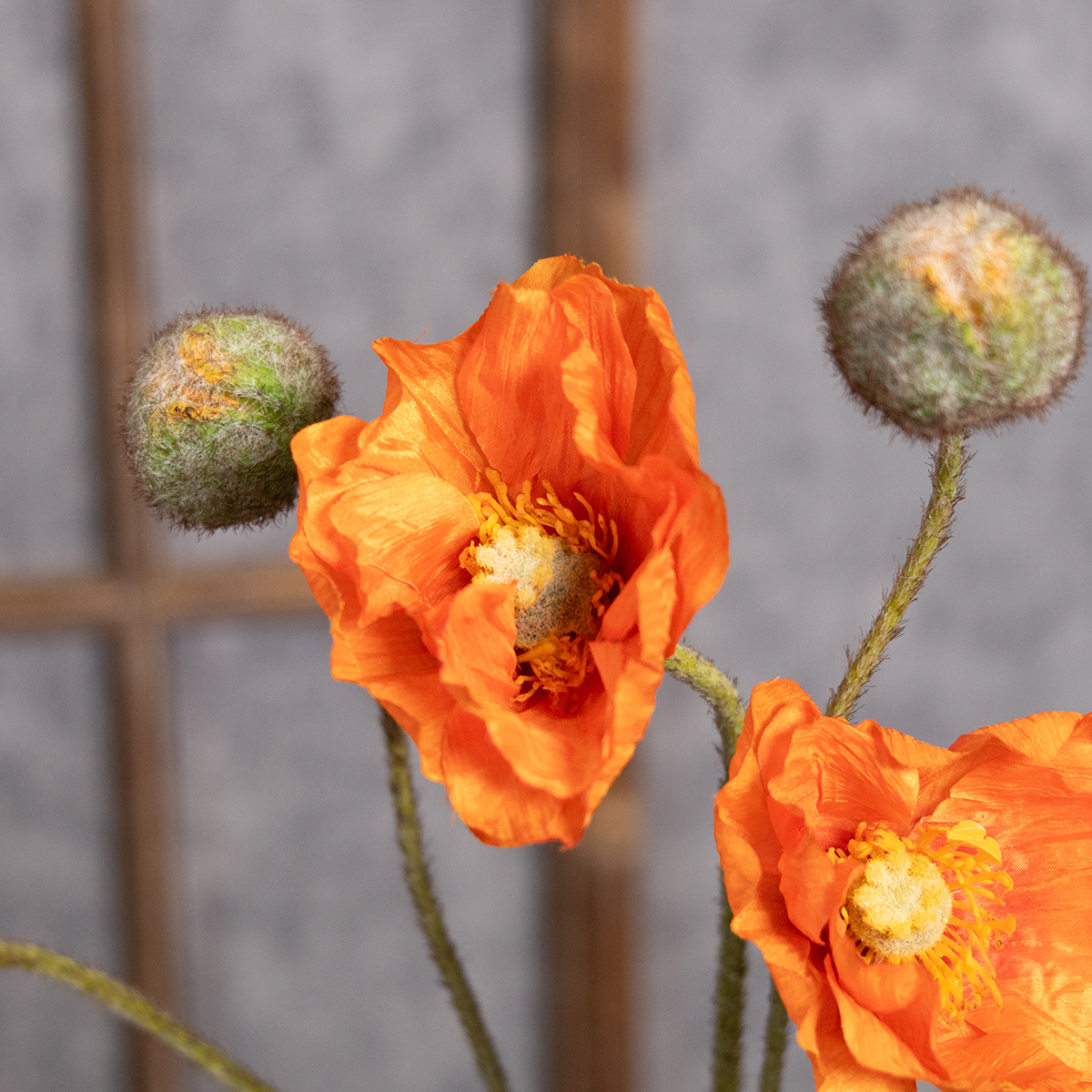 Šilta oranžinė spalva gražiai dera su natūralios medienos atspalviais, aukso spalvos dekoru arba minimalistiniais juodais baldais moderniu stiliumi. Mūsų patarimas: derinkite aguonų puokštę su subtiliomis baltomis džiovintomis gėlėmis arba žaliais dirbtiniais augalais, kad sukurtumėte gyvybingą ir subalansuotą vaizdą. Ypač šventinėmis progomis, tokiomis kaip vakarienės ar vestuvės, puokštė bus tikras akį traukiantis akcentas ant stalo.