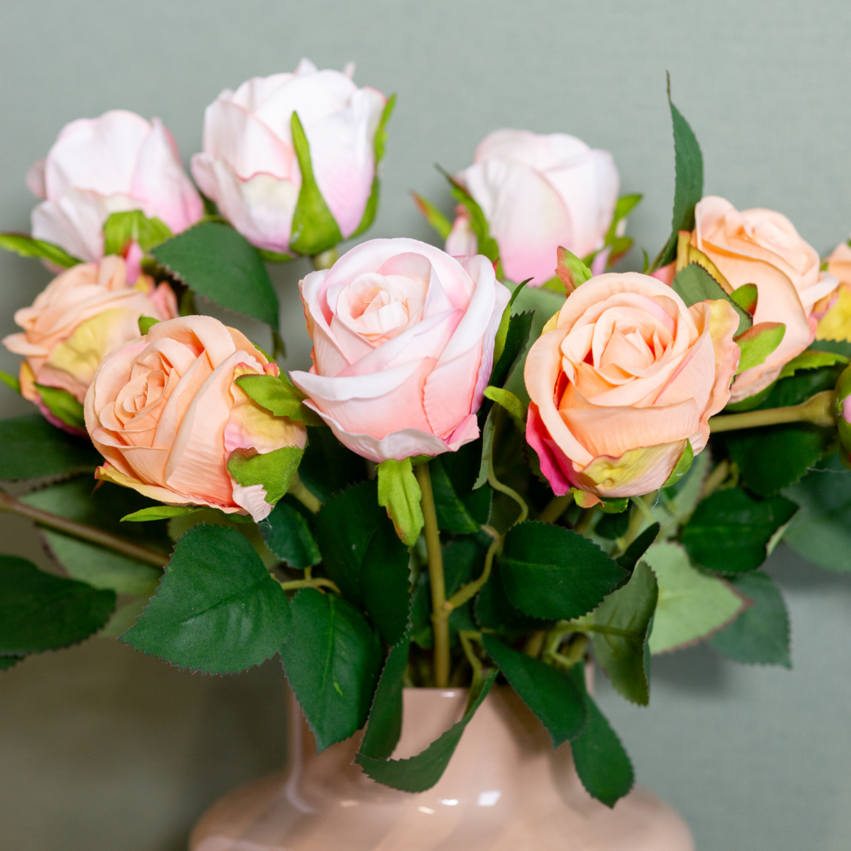 Ar mėgstate rožių žavesį, bet norite išvengti jų priežiūros rūpesčių? Jokių problemų! Su mūsų dirbtinių rožių puokšte galite į savo namus atnešti nesenstantį gėlių karalienės grožį. Puikiai tinka visiems, kurie vertina elegantišką dekorą be šviežių gėlių. Nesvarbu, ar tai būtų svetainės akcentas, žavinga stalo puošmena ypatingoms progoms, ar stilinga dovana – ši rožių puokštė suteiks ypatingą atmosferą bet kuriam kambariui. Subtilūs rožiniai šilko žiedai kartu su žaliais lapais atrodo taip neįtikėtinai tikroviškai, kad galite beveik pamiršti, jog jie dirbtiniai. Jūsų svečiai bus nustebinti!