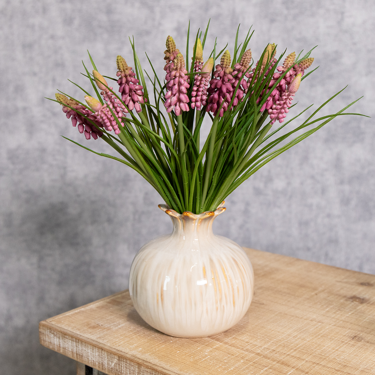 Norėdami sukurti itin harmoningą vaizdą, derinkite vynuogių hiacintus su kitomis dirbtinėmis pavasario gėlėmis, tokiomis kaip narcizai, tulpės ar plukės. Įsivaizduokite, kaip tokia kompozicija atrodytų kaimiškoje medinėje dėžutėje ant kavos staliuko – tiesiog gražu! Hiacintai taip pat suteikia stilingą akcentą siauroje stiklinėje vazoje ar keraminiame vazone. Galimybės neribotos.