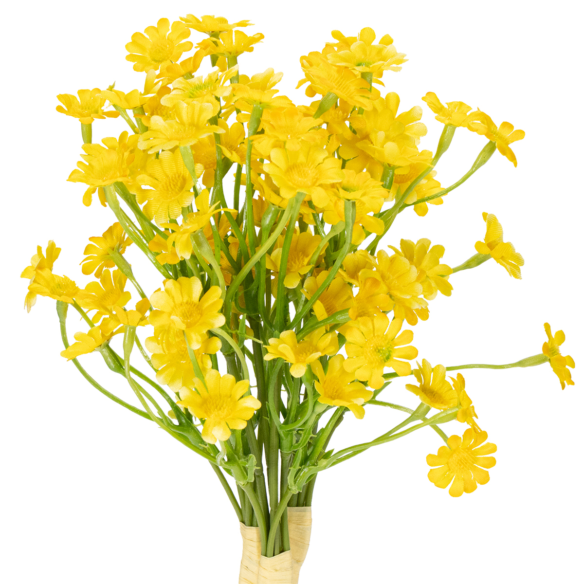 Šios dirbtinės ramunėlės ryškiai geltonų atspalvių sukuria draugišką, šiltą atmosferą, kuri tiktų bet kuriame kambaryje. Jos subtilūs žiedai atrodo nepaprastai tikroviški, o tvirti stiebai perteikia įspūdingą autentiškumą. 28 cm aukščio puokštė harmoningai dera su įvairiais indais – tiek paprastose vazose moderniam vaizdui, tiek kaimiškuose vazonuose kaimiškam stiliui.
