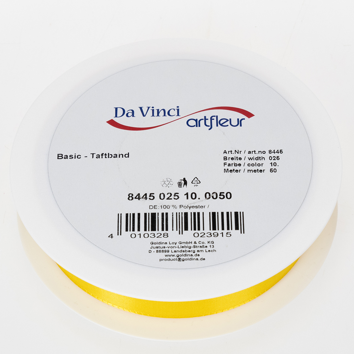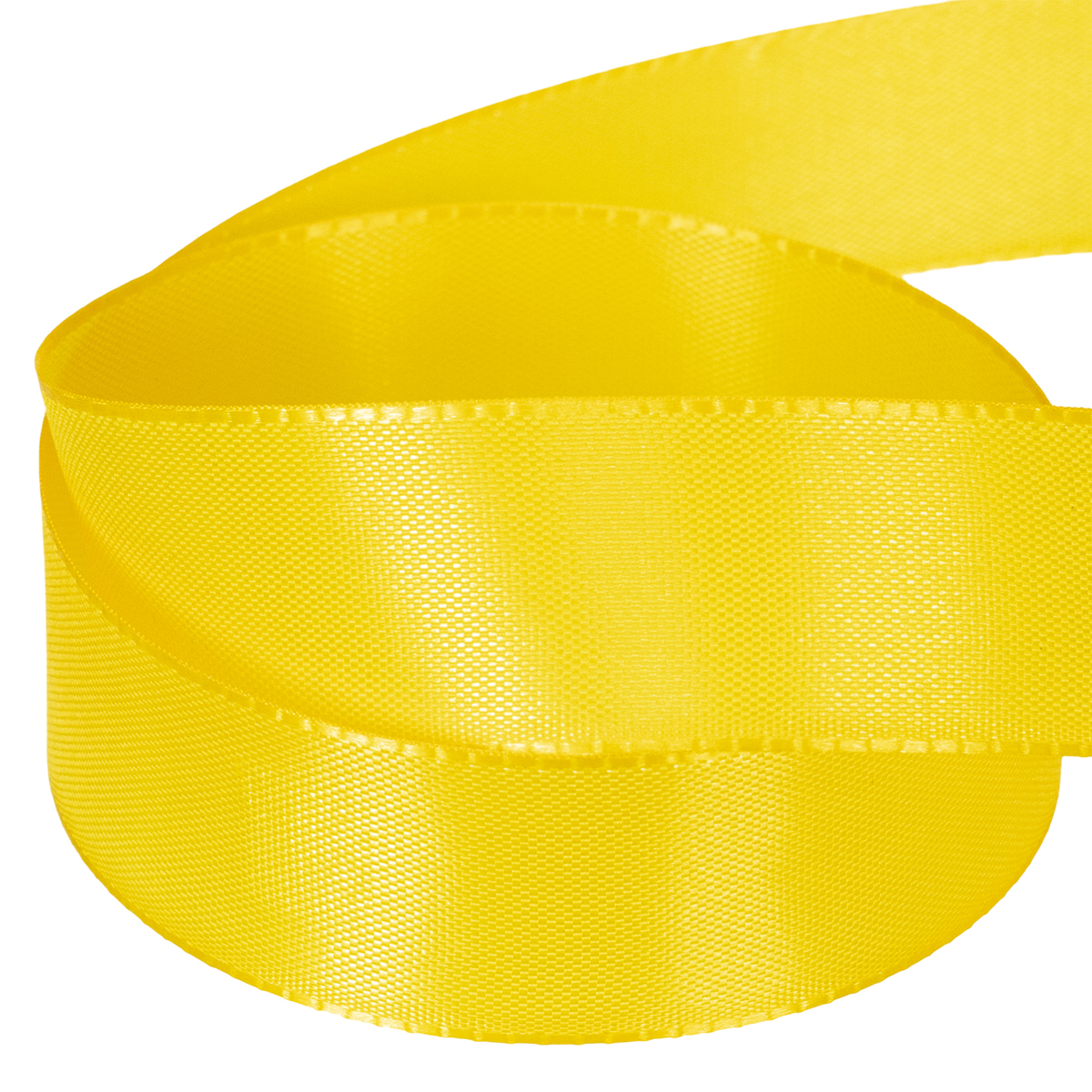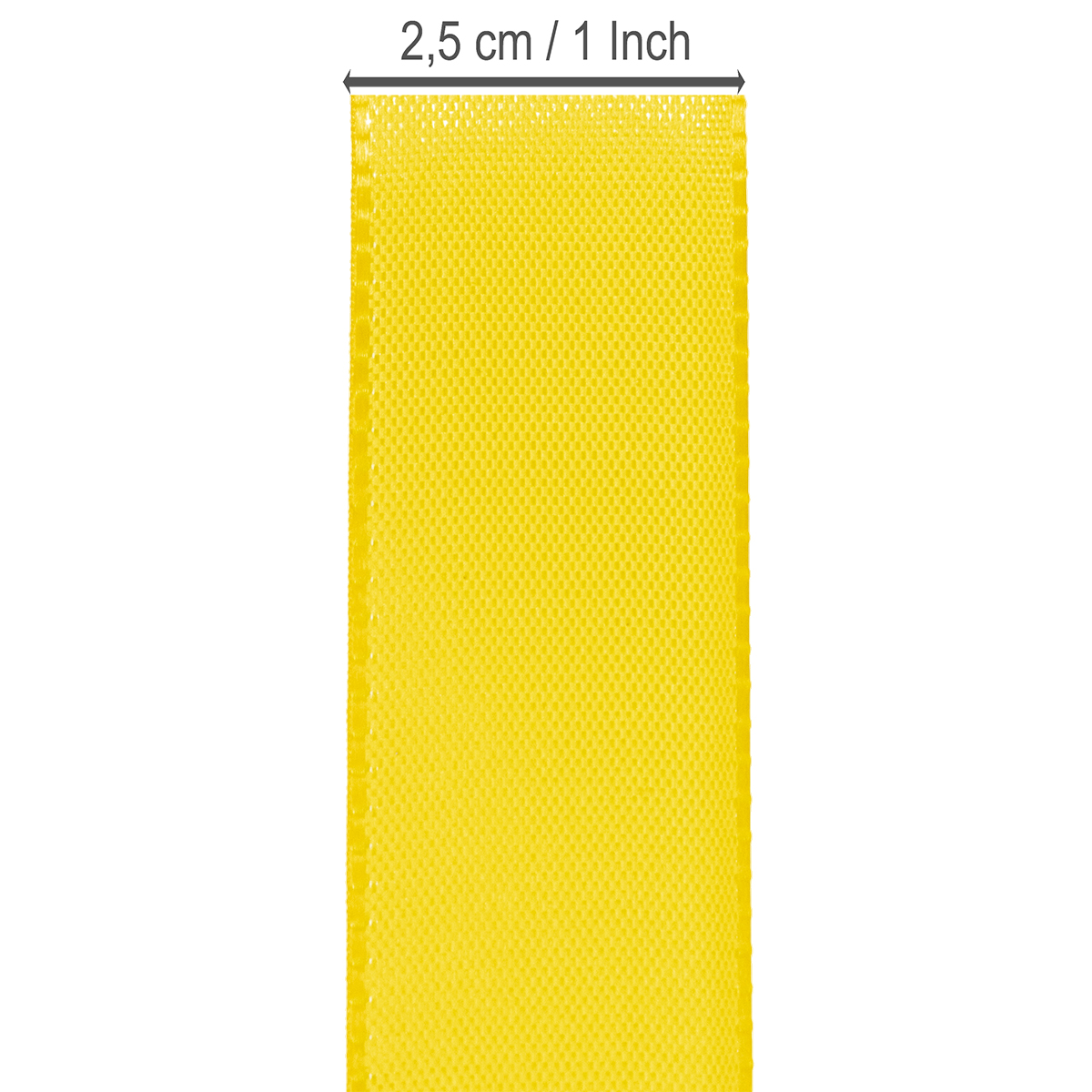 Geltonos spalvos dovanų ir dekoravimo juostelė yra apie 25 milimetrų pločio ir apie 50 metrų ilgio.
