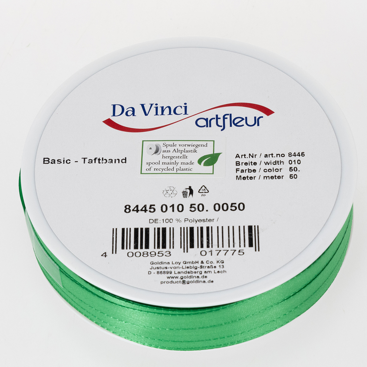 Produkto pavadinimas: Dovanų ir dekoracijų juostelė, žalia taftos juostelė, 10 mm pločio, 50 m ilgio