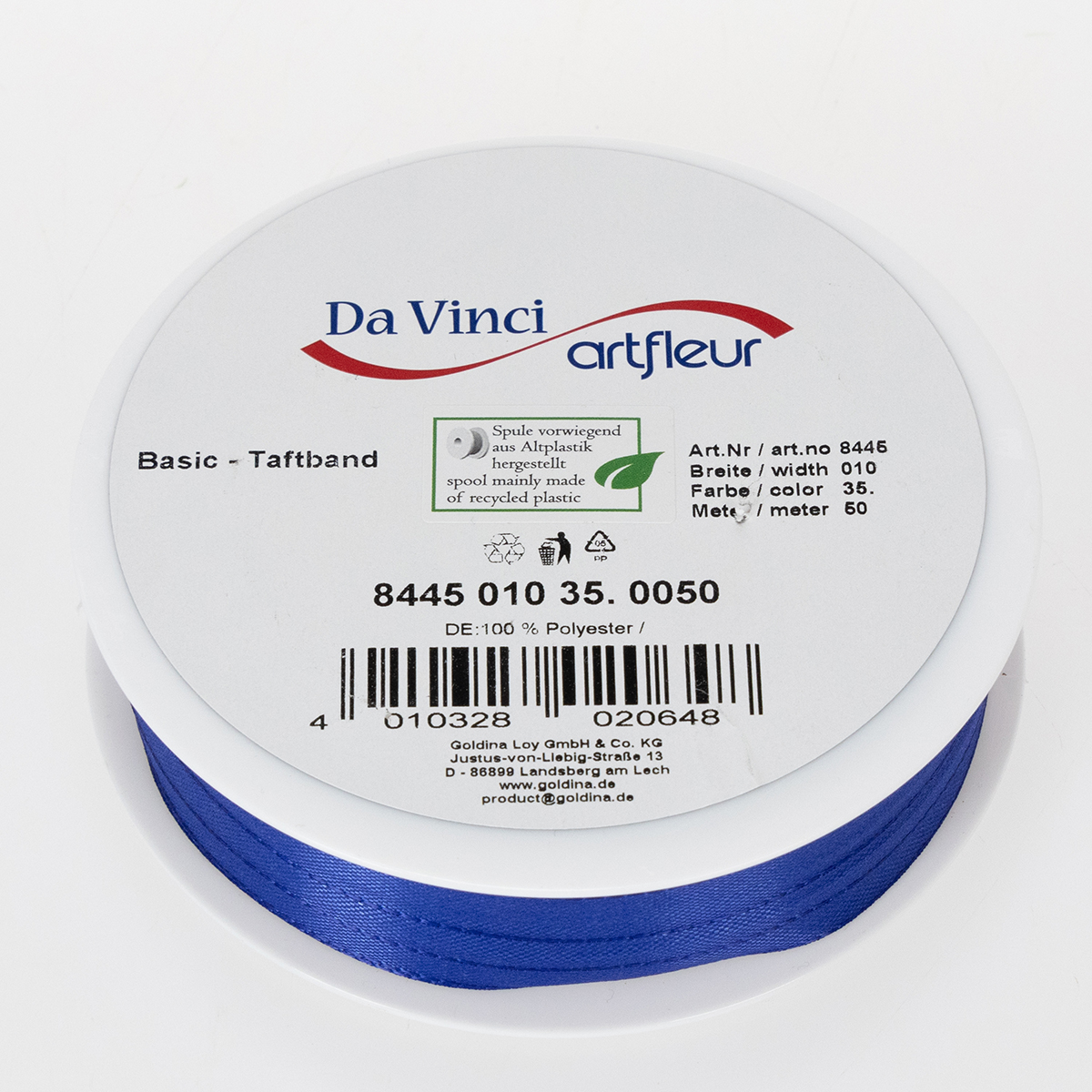 Dovanų ir dekoracijų juostelė tamsiai mėlynos spalvos yra 10 milimetrų pločio ir maždaug 50 metrų ilgio.