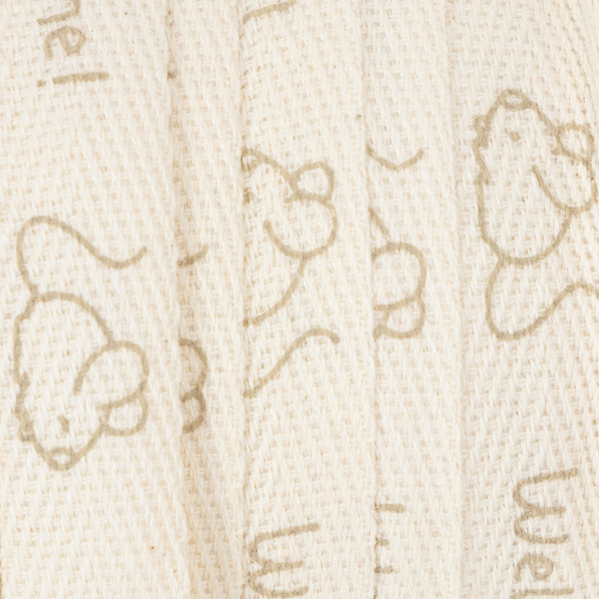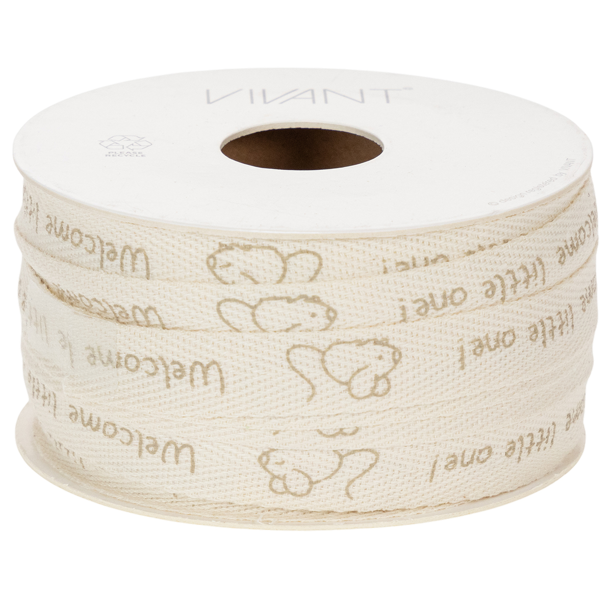 Ant kreminės spalvos juostelės, pagamintos iš grynos medvilnės, šviesiai ruda spalva atspausdintos smalsios pelytės ir sveikinimas „Sveiki, vaikeli!“. Dekoratyvinė juostelė, pagaminta iš natūralios medvilnės medžiagos, yra biologiškai skaidoma ir yra ant kartoninės ritės, kad būtų užtikrintas tvarumas. Tai reiškia, kad krikšto dekoravimui nereikia jokio plastiko.